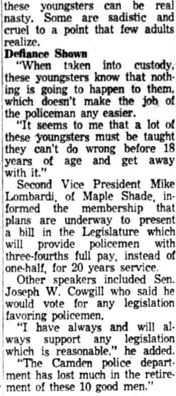 THREE MEN NABBED IN NORTH CAMDEN ROW Three young men were found guilty of disorderly conduct in police court this morning when they were charged with creating a disturbance In front of a restaurant near Sixth and Market streets. Fiore Rossi, 23 years old, 329 Mickle Street, brother of ‘Pee Wee’ Rossi, local pugilist, was sentenced to 60 days in the county jail. Thomas O’Neill, 22 years old, 204 Berkley Street, was fined $20 and sentence was suspended on John Develin, 21 years old, 1002 Penn Street. Rossi was charged with severely beating August Fortune, a policeman assigned to special duty at the restaurant. Patrolman Fred Mueller testified that at 3:30 o’clock Sunday morning he had told the men to “move on” from Fifth and Market Streets when he found them creating a disturbance. The men walked away and in front of the restaurant again became boisterous. Moeller and policeman Marshall Thompson then arrested O’Neill who had become “sassy”. The other two objected to the arrest, and when Fortune came from inside the building to assist his brother officers, he was struck in the face and knocked down by Rossi. The three succeeded in taking the men to headquarters. Rossi this morning admitted hitting Fortune but said he did not know he was an officer and “thought he was a wise guy trying to go big with a woman’. |