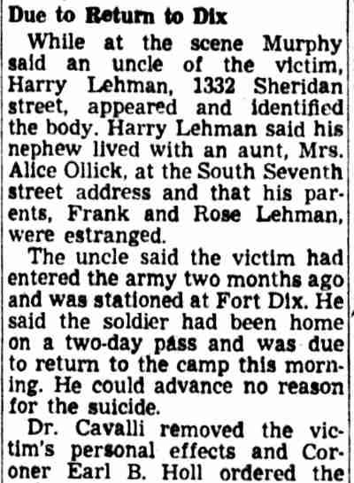 A passerby who thought he saw a house afire on Taylor Avenue near Third street, turned in an alarm that brought four fire companies on a monkey run yesterday. It required more than five minutes to find the house reported afire when the apparatus pulled up at the alarm box at Third and Federal streets. Two policemen, Sergeant nathan petit and Marshall Thompson, who followed firemen to the scene were quicker than that for they found the house and a young woman hiding in the closet on the second floor. She was arrested along with a woman and a man. Taken to police headquarters the young woman, who identified herself as Margaret Pone, 17, of Park Avenue, Maple Shade, was held on a charge of vagrancy. Margaret Johns, and Louis Archer, 39, both Negroes, who were also found in the three-story dwelling at 230 taylor avenue, were also held as material witnesses. The reported fire turned out to be the smoking stove. |