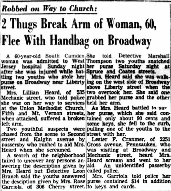 - Stanley Slagle - James J. Lenahan Robert Sharp - Mary Lynch - Charles Clark - Lynch's Cafe - North Front Street Thomas Murphy - Harry Tracy - William Kelly - Oliver Morgan - John J. Hegar Harry Kyler - Vincent Conley - broadway - Federal Street - South 7th Street - John V. Wilkie Kaighn Avenue - Liberty Street - North 3rd Street |