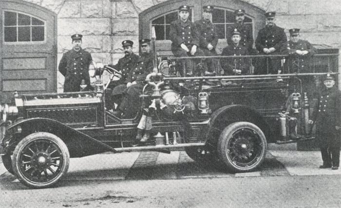 This 1912 Robinson Combination Chemical and Hose Wagon was assigned to Engine Company 2. It was one of two purchased as the first motorized apparatus in the Department. Pictured in this 1913 photograph are (l to r): Fireman John Lennox, Wagon Chauffer Harry Hankins, Firemen William Elberson, Joseph Ernst, Martin Carrigan, and Captain George Wade. Accompanying them are members of the engine crew: Stoker Arthur Wingate, Driver joseph johnson and Engineer John Augusts "Gus" Dold. |