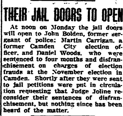 TO PROBE $200,000 KAIGHN AVE. FIRE FIRE CAPTAIN MAY DIE, FOUR OTHERS INJURED; DAMAGE IS $200,000 Economy Store and Other Buildings Near Broadway Swept by Flames Early This Morning- Falling Debris Carries Men Through Roof And Into Cellar- Sleeping Inmates of Apartments Roused and Invalid Carried to Safety- Mayor Sees Rescues Mayor Ellis has ordered an investigation to determine the cause of the $2000,000 fire which swept the properties at 427 and 429 Kaighn Avenue and caused injury to five firemen, one of whom may be fatally hurt. The fire centered about the property occupied by the Economy Store, formerly Handle’s, and quickly spread to four adjoining buildings. The fireman whose recovery is despaired of is Captain Martin B. Carrigan, of Engine Company No. 2, Fifth and Arch Streets. Carrigan, who lives at 618 West Street, is suffering from a fractured skull and severe burns and cuts of the face, legs, and body. He is unconscious at Cooper Hospital. The firemen were injured when a wall, weakened by the intense heat, crumbled and crashed through a roof upon which they were standing, dragging them through the floor below, and into a cellar. Sensational rescues followed as police, firemen, and citizens with bare hands tore at the hot debris. The men were quickly extricated and carried to the street. “We certainly shall investigate this fire,” the Mayor declared today. “Just what was the cause and who is to blame has not been determined but there will be a thorough investigation.” “There have been too many of these fires during the past few weeks” continued the mayor. “Surely all of them did not just happen and I am sure there has been someone responsible in one or two of the fires.” The conflagration was one of the most spectacular of a series of large fires that have visited the city in the past six weeks. The block in which it occurred- Kaighn Avenue between Broadway and Fourth Street is one of the most prominent business squares in Camden. Flames shot 200 feet in the air, giving the sky a fiery hue and attracted attention for miles before the firemen brought it under control. The flame-lit sky was clearly seen in Philadelphia, Merchantville, East Camden, Gloucester and other communities. More than a score of families living in the vicinity were forced to flee from their homes in scant attire when the fire threatened them. They were cared for by neighbors. Fireman George Boone, 46 years old, of Engine Company No. 2, also is in a serious condition. He is suffering from burns of the right hand, right thigh and foot and probable internal injuries. Boone lives at 607 Mount Vernon Street. The other injured foremen are: John Voll, 22 years old, 509 Royden Street: both hands badly burned. C.J. Andrus, aged 31 years, 570 Mount Vernon Street: burns of hands and legs. Harold Lorang, 29 years old, 19 Hudson Street: burns of right hand and legs and sprained ankle. Firemen Prove Heroes Carrigan and Boone are in the hospital. The other firemen were discharged after their wounds were dressed. After being released from the hospital they returned to the scene of the fire and insisted upon continuing their duties. Chief Peter B. Carter, however, ordered them home. Most of the loss was suffered by the Economy Store. A few charred walls remain of the large building. The interior was completely gutted. It was estimated today that the damage to that property will total $60,000 At least $50,000 damage, it was said, was done to the stock. Morris Handle, local theatrical man, who owns the building, declared today that the property was insured for $30,000. “My loss will be quite heavy,” said Mr. Handle. “The insurance will not pay one-half the property damage.” The adjoining building at 431 Kaighn Avenue is occupied by Dr. S.I. Yubas, optometrist, and L.R. Yubas, his father, a jeweler. Invalid is Rescued The rear and upper floors of the Yubas property were gutted and the stock sustained a heavy loss, due to water and smoke. The damage will total $40,000, Mr. Yubas estimated today. Five persons who were asleep on the upper floors of the Yubas dwelling had narrow escapes. They were awakened by Samuel Goldstein, haberdasher, 417 Kaighn Avenue, who discovered the fire in the Economy Store and turned in the alarm. Mrs. L.R. Yubas, an invalid, was rescued with difficulty. The property occupied by Mrs. Sadie Bodner, a widow, at 433 Kaighn Avenue, as a house furnishings store, was scorched and also damaged by water and smoke. Adjoining the Economy Store on the west at 425 Kaighn Avenue is a vacant one-story structure, formerly occupy by the United Beef Company. Firemen were on the roof of that building when the west wall of the Economy Store collapsed. The wall tumbled down on the small roof and hurled the firemen through a hole in the roof, through the floor and then into the cellar. Several Stores Damaged Three policemen, Joseph Sparks, Thomas Cheeseman, and George Hill- and several spectators braved the fire and smoke to rescue the trapped firemen. The property at 423 Kaighn Avenue, occupied by the Charles Jamison Department Store, was damaged in the rear and the stock ruined by water and smoke. The Kresge Five-and-Ten-Cent Store, at 519-531 Kaighn Avenue, was also damaged by water. Louis Richelson, who owns the properties from 519 to 525 Kaighn Avenue, was unable to estimate his loss today. Collapse of Wall Hundreds of spectators, who were watching the fire from the opposite side of the street, shuddered as they saw a brick wall, weakened by the intense heat, totter and sway. Before the firemen on the smaller roof below could scurry to safety, it collapsed. A groan escaped the crowd as they heard the cries of the entrapped firemen and the deafening thud of the brocks as they landed on the roof where the firemen were at work. As the full weight of the brocks struck the roof, it caved in forming a gaping hole. The firemen were literally swept into the opening. The bricks tumbled down, causing an
