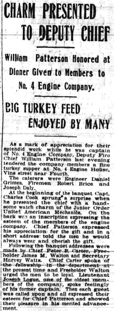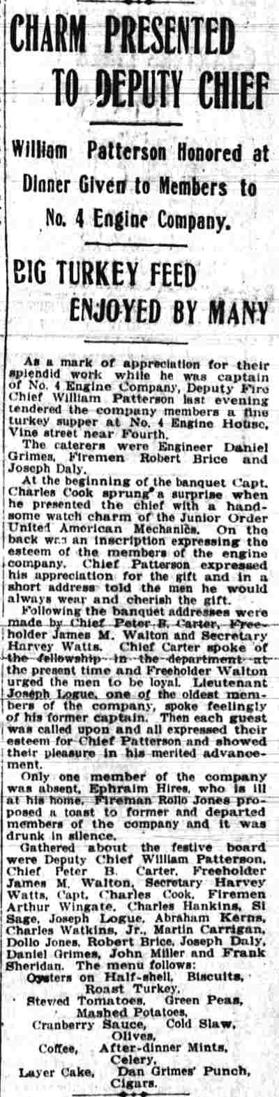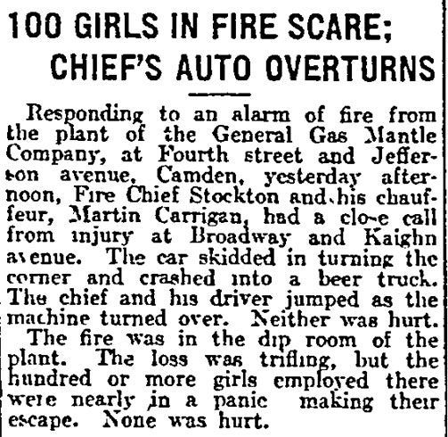 Alarms of Fire Before and After Carrigan Funeral Just before Camden firemen were planning to leave headquarters yesterday to march to the home of Captain Martin B. Carrigan, who lost his life in the falling roof at the Economy Store fire, they were summoned to a three alarm fire at the stables of Hugh A. Greenan, 1736 South 7th Street. When Engine Companies No. 7 and 8 reached their fire houses this morning after the Carrigan funeral, an alarm was received from the drugstore of W.J. Grobiowski, 1250 Everett street. The Grobowski fire had its origin in a pile of rubbish in the basement and was extinguished with a small loss. |