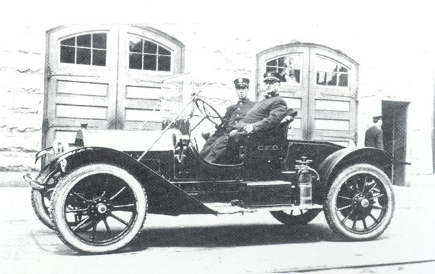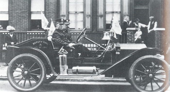 Aide Fireman Martin Carrigan with Chief of Department John A. Stockton in 1913 Cadillac at Fire Headquarters, Fifth and Arch Streets. |