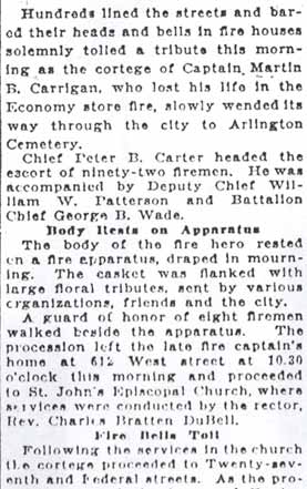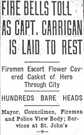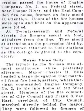 CARRIGAN'S DEATH Camden today is paying tribute to a hero who died in the course of his duty. City buildings, including police and fire stations, are draped in mourning over the death of Martin Carrigan, 49 years old, who died early yesterday in Cooper Hospital from injuries received in fighting the Kaighn Avenue fire Wednesday. The fire, the origin of which is being investigated by the police, destroyed the Economy Department Stores, 427-429 Kaighn Avenue, and damaged four adjoining buildings. Flags are flying at half-mast as a mark of tribute to Captain Carrigan. The firehouse at Fifth and Arch Streets, headquarters of Engine Company No. 2, of which Carrigan was captain, is buried in black bunting. As a further tribute to Carrigan his comrades will attend his funeral in a body on Monday morning, at ten o'clock. Headed by Chief Peter B. Carter, all the firemen not on duty at the time will march from Headquarters at Fifth and Arch Streets to Carrigan's home at 618 West Street. Interment will be in Arlington Cemetery. The body may be viewed Sunday afternoon at three o'clock. Mayor ellis, Frank S. Van Hart, president of City Council and members of the fire committee will head a platoon of firemen who will view the body Sunday afternoon. They will assemble at fire headquarters, Fifth and Arch Streets. at 2:30 o'clock, before marching to the late fire captain's home. Members of the fire committee paid special tribute to the dead fire fighter at their meeting last night. Captain Carrigan was characterized a mighty good man and an incomparable fireman. The committee unanimously voted that the city pay the expense of the funeral. |