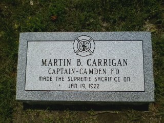 Martin Carrigan was buried in an unmarked grave at Arlington Cemetery in Pennsauken NJ, in grave SS-436-1. Friends and members of the Camden Fire Department raised money and furnished a headstone in September of 2019. |
