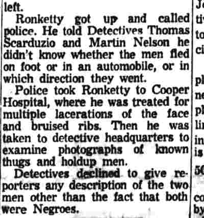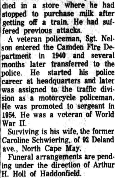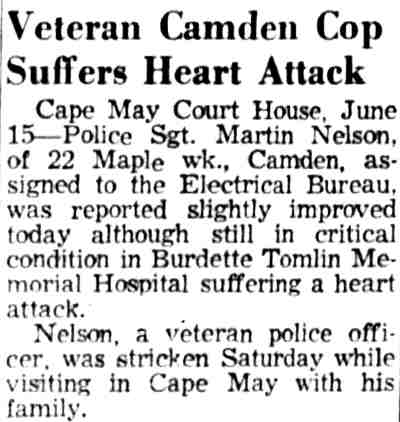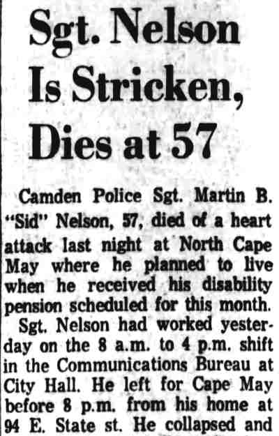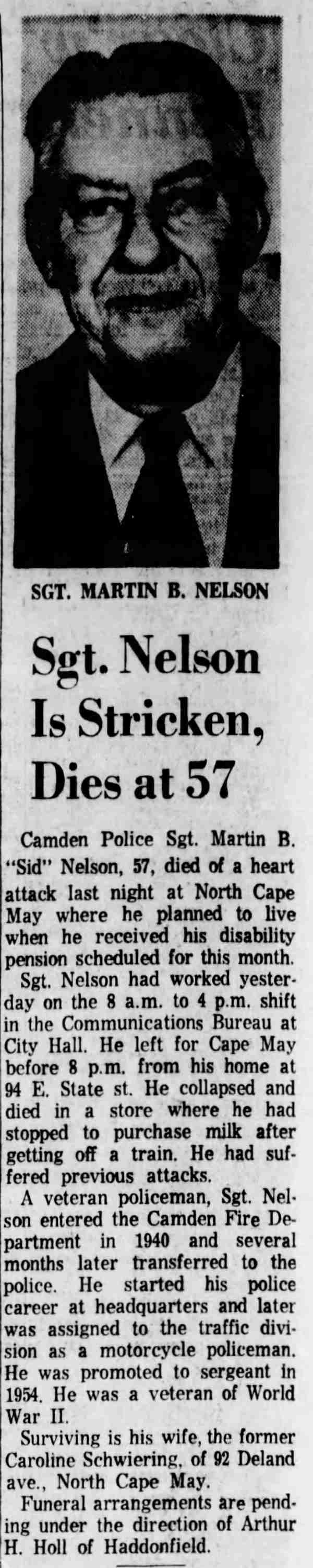 on his release from military duty. Martin Nelson's father, who lived with him at 561 Spruce Street, died in 1954. Martin & Caroline Nelson stayed at the spruce street home as late as the fall of 1956, then moved to 22 Maple Walk in Camden's Fairview neighborhood. Still employed with the Camden Police Department, Martin Nelson had had moved to North Cape May, New Jersey and had filed his retirement papers when he suffered a fatal heart attack on his way home from work on October 1, 1964. He was buried at Beverly National Cemetery in Beverly, New Jersey. |