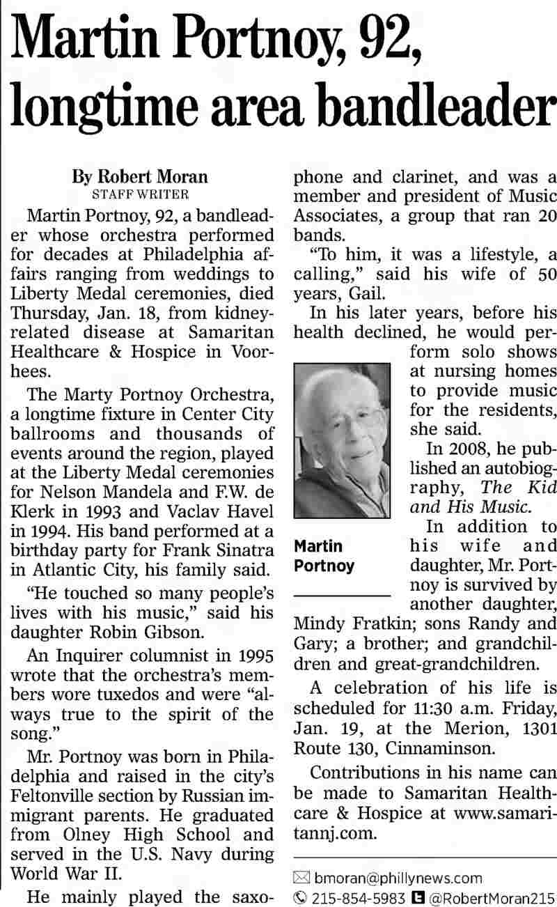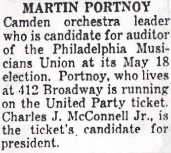 MARTIN PORTNOY was born on May 3, 1904. A professional musician, he was active in the Philadelphia Musicians Union. By May of 1950 he was leading his own band. the Marty Portnoy Orchestra, and was a living at 412 Broadway in Camden NJ. Besides music, he ran an electrical fixtures store out of the Broadway address in the 1950s. Martin Portnoy was still leading his orchestra in the Delaware Valley, 53 years later, in 2003. In his later years he performed solo at nursing homes. He passed away on January 17, 2018 at the age of 92.