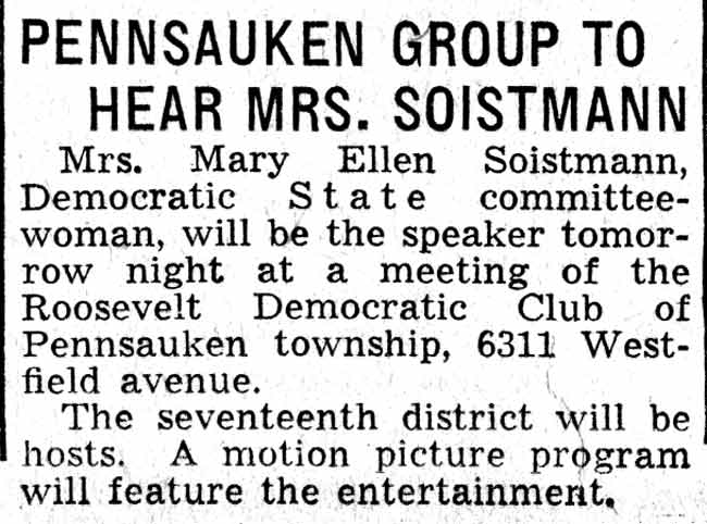 MARY ELLEN SOISTMANN was born in new Jersey to Patrick and Isabela McVeigh on July 28, 1893. Her father, Patrick J. McVeigh, was active politically as a Democrat. The 1906 Camden City Directory shows the family at 569 Trenton Avenue. She grew up in Camden's Ninth Ward, the family living at 520 Trenton Avenue at the time of the 1910 Census. By 1914 the family had moved to 791 Line Street. Both Patrick McVeigh Sr. and his son Patrick Jr. worked as potters at the Camden Pottery works. Another older brother, Thomas, worked as a railroad brakeman. By 1914 Mary Ellen McVeigh had also gone to work, as a clerk, and later as a bookkeeper. She married Adolph Soistmann, who was living at 791 Line Street in 1917, shortly after registering for the draft in June of 1917. A daughter, Marie was prior to the January 1920 Census. The relationship appears to have had some difficulty, as the 1920 Census shows Adolph Soistmann in Los Angeles and Mary Ellen Soistmann living with her parents and brothers in Camden. Adolph Soistmann apparently was dogged by poor health, leaving Mrs. Soistmann a widow by 1929. Mary Ellen Soistmann was working as a bookkeeper at the RCA-Victor factory in Camden when the Census was taken in April of 1930. She was living with her daughter and widowed mother in a house they owned at 795 Line Street. Mary Ellen Soistmann followed her father into politics, and by 1934 had become a Democrat county committeewoman from Camden's Ninth Ward. By the early 1940s Mrs. Soistmann had begun to work for the Housing Authority of the City of Camden. In 1943 she took over as manager of the Westfield Acres project in East Camden upon the suicide of its previous manager, Meyer Wessel. She later managed the Peter J. McGuire Gardens public housing project in East Camden. The 1947 Camden City Directory shows Mary Ellen Soistmann living at 319 North 34th Street in East Camden. She was still at that address as late as the fall of 1970. Mary Ellen Soistmann was still living in Camden when she passed away in August of 1972. |
