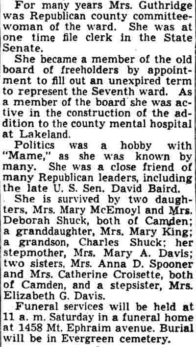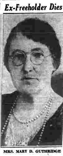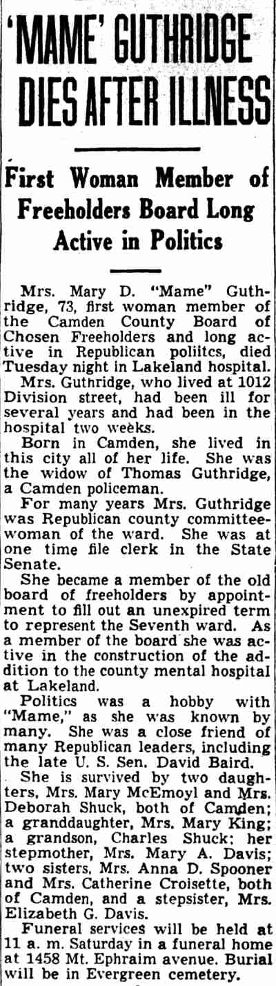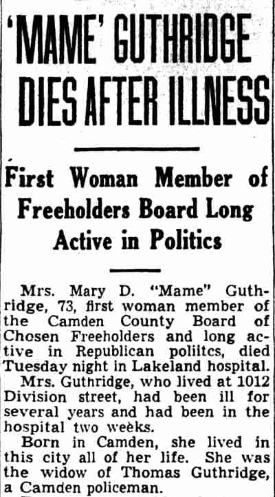 MARY D. "MAME" GUTHRIDGE was born in Pennsylvania in 1869. She married Thomas Guthridge at 19. He was a son of John Guthridge. The Guthridge family lived at 427 Walnut Street at the time of the 1880 Census and through the compilation of the 1890-1891 Camden City Directory. They later moved en masse to 422 Walnut Street. Thomas Guthridge served as a police officer in Camden during the 1900s and 1910s. Brother-in-law William Guthridge worked for the State of New Jersey as a Fish and Game Warden. Thomas and Mary Guthridge made their home at 759 Mount Vernon Street. Thomas Guthridge died on January 26, 1918. Mary Guthridge was still at that address in April of 1930. Active in local politics, Mary Guthridge served on the Camden County Board of Freeholders from Camden's 7th Ward. She was the first woman to take a seat as a Camden County Freeholder, joining that body in 1930 and serving through at least 1931. By 1940 she had moved to 1012 Division Street, where she lived with her daughter, Mrs. Gertrude Schuck and grandson Charles A. Schuck when the Census was enumerated in 1940. Mary Guthridge last resided at 1012 Division Street. She passed away at the county hospital at Lakeland on July 7, 1942 and was buried in Evergreeen Cemetery. |