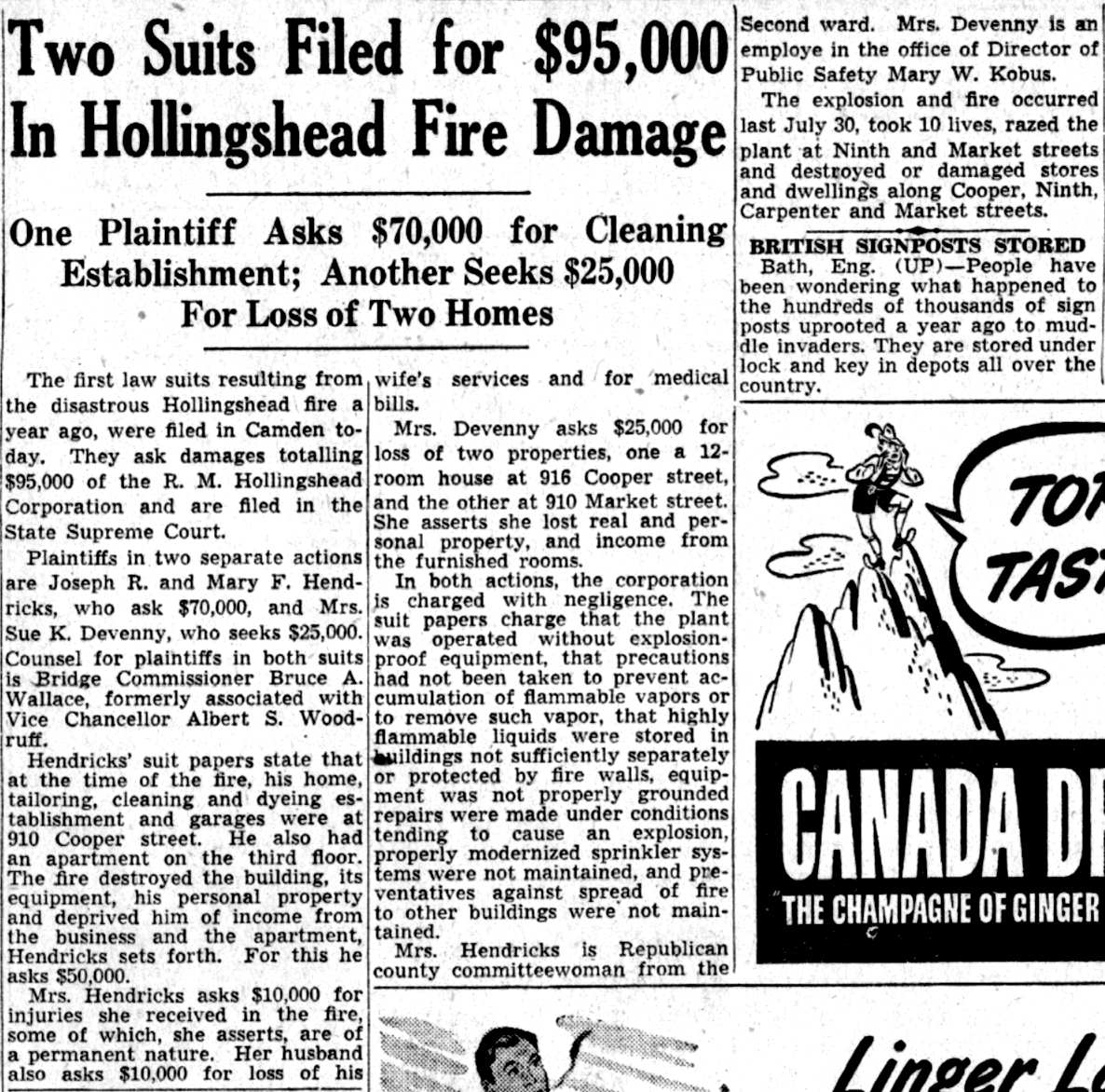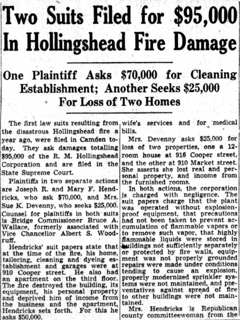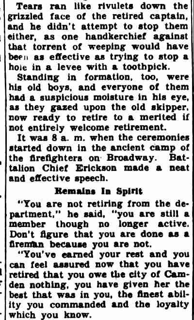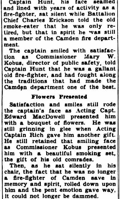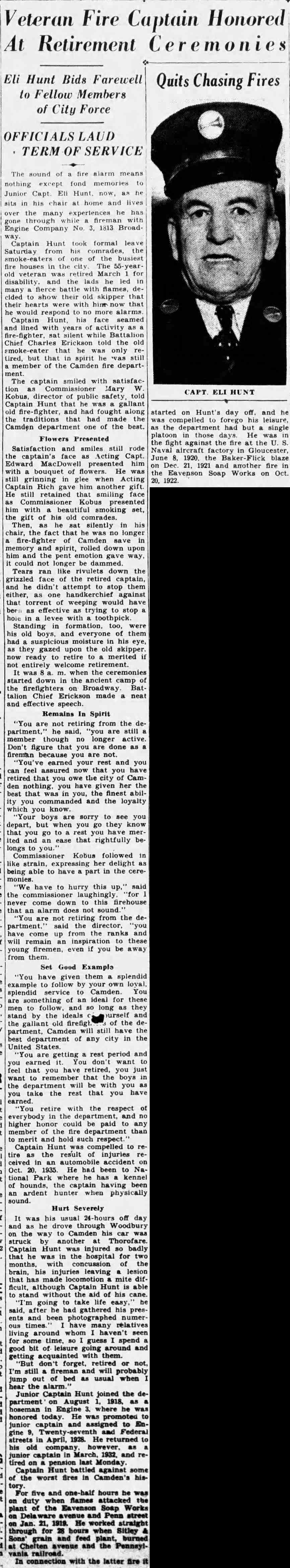 Magin Laid to Rest By War Veteran Buddies Funeral services for City Commissioner Henry Magin were held today with his colleagues in official and veterans circles participating. Services were conducted in city commission chambers on the second floor of city hall, in charge of Rev. Dr. W.W. Ridgeway, rector of St. Wilfrid's Episcopal Church. The casket was carried by war veteran associates of the public works director, who died from a heart attack Friday. A color guard from the Veterans of Foreign Wars and the American Legion preceded the casket, followed by the four remaining members of the city commission, Mayor George Brunner and commissioners E. George Aaron, Mrs. Mary W. Kobus and Dr. David S. Rhone . A guard of honor lined both sides of' city hall steps, 22 policemen on one side and 22 firemen on the other, representing Magin's age, 44 years. Hundreds of men and women waited outside the building to pay their respects as the solemn procession filed by. Mayor Brunner had declared this morning a holiday for city employees. The casket was borne by Thomas Jackson and Samuel Magill, both past Legion commanders; Leon McCarty, past commander of August Walter Chapter, Disabled American Veterans; Richard Jermyn, past commander of Post 1270, Veterans of Foreign Wars; Benjamin P. Thomas, past captain of Sparrow Ship No. 1269. V. F. W.; and William Miller, past State commander, D. A. V. Three trucks were required to carry the floral pieces from the scene of the services to the National Cemetery at Beverly, where burial took place. An estimated 8000 persons from all walks of life paid their respects to the late official by viewing the body as it lay in state in the commission chambers. The throng of mourners of Camden city and county was the largest to converge on a public building since the funeral of Fire Chief Charles Worthington, who was killed while fighting a fire almost 20 years ago. His body was placed on public view in the rotunda of the old county courthouse. File Past Bier A continuous progression of people filed past the flag draped bier for more than three and one-half hours. Scores of Republicans and hundreds of Democrats joined in the tribute. Services were conducted by Camden lodges of Elks and Moose. Military rites were conducted by the Fairview Post, American Legion, of which Magin was a founder and past commander. The tribute was led by Mitchell Halin, post commander, and C. Richard Allen, past department commander. James W. Conner, chief clerk of the city water bureau and past State Commander of the V.F.W., conducted rites at the grave. Mayor Brunner and Commissioners kobus, Aaron, and Rhone came early and remained throughout the hours of viewing. Mrs. Helen Magin, the widow, and daughter Helen, attired in deep mourning, arrived shortly after 7:00 PM. Embraces Widow, Daughter Commissioner kobus , who knelt in prayer before the bier, arose and went over to Mrs. Magin and her daughter. mrs. kobus embraced and kissed the widow and daughter of the late commissioner. They were in tears. Three firemen and three policemen maintained a vigil as a guard of honor. They were Patrolmen Jack Kaighn, George Weber, and William Deery and Firemen Cramer Hill , Warren Carter and William Reed. American Legion and V. F. W. members in uniform alternated as members of the military guard of honor. A detail of 50 policemen was under command of Acting Lieutenant John Garrity. Fifty firemen, under supervision of Deputy Chief Walter Mertz, assisted the patrolmen in handling the crowd, which at times choked the stairways leading to the second floor. Freeholders Arrive Albert H. Molt, director of the Board of Freeholders and Freeholders John J. Tull, oscar moore, Ventorino Francesconi, Stanley Ciechanowski, Earl Armstrong and Emil J. McCall arrived shortly after 7:00 PM. Moore and Tull wore American Legion overseas caps. Albert S. Marvel, clerk of the board, accompanied the freeholders. Employees of the various bureaus in the department of public works, headed by Commissioner Magin, came in delegations with the highway bureau having 150, the largest number. Frank A. Abbott , acting director of the department, accompanied by James P. Carr, superintendent of Streets; led the highway bureau employees. Abbott is deputy director of revenue and finance and first assistant to Mayor Brunner. He was named by Brunner as acting director until the City Commission elects Mr. Magin's successor. County Clerk frank J. Suttill, City Clerk clay W. Reesman , Fire Chief john H. Lennox and James A. Howell, chief of the city electrical bureau, attended, as did Albert Austermuhl, secretary of the board of education. Every city department sent a flora l piece. Outstanding Floral Tribute Outstanding among the floral tributes was a six-toot broken circle of varied flowers, an offering from Mayor Brunner and Commissione rs kobus , aaron, and rhone. A floral chair was sent by the Camden Police and Firemen’s Association. The word “Rest” was made up of flowers. The offering of the Veterans League of South Jersey, an organization formed by Commissioner Magin and of which he was the first president, was a large floral pillow. The freeholders and county officials gave a large floral basket. Floral tributes came from the employees of the board of education, the RCA Manufacturing Company, the police and fire bureaus, Pyne Point Athletic Association, the elks , Moose and several Democratic clubs. The floral tributes came in such numbers yesterday afternoon that Funeral Director Harry Leonard and his assistants could not find room for them in the commission chamber proper. They were banked on both sides, in the rear and over the ca sket. Among prominent officials and citizens who came to pay their respects were Congressman Charles A. Wolverton and his son, Donnell, Assemblymen Joseph W . Cowgill and J. Frank Crawford, Sidney P. McCord, city comptroller, Thomas C. Schneider, president of Camden County Council No. 10, New Jersey Civil Ser