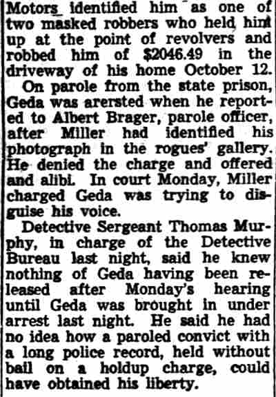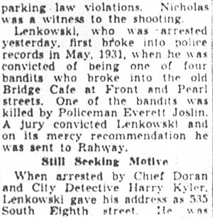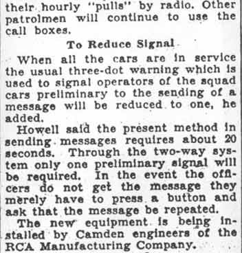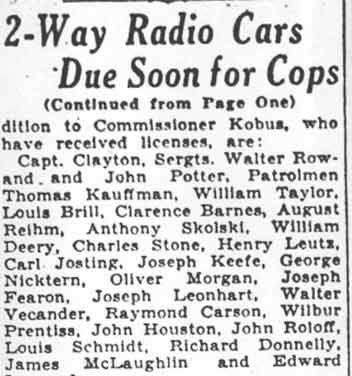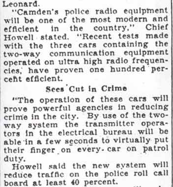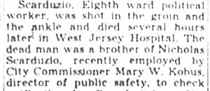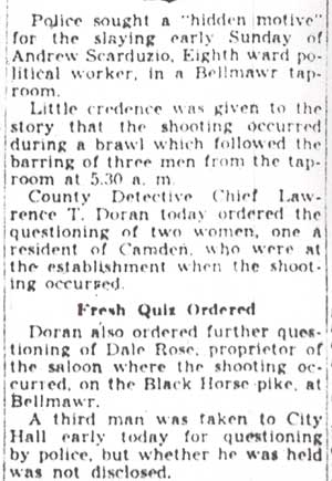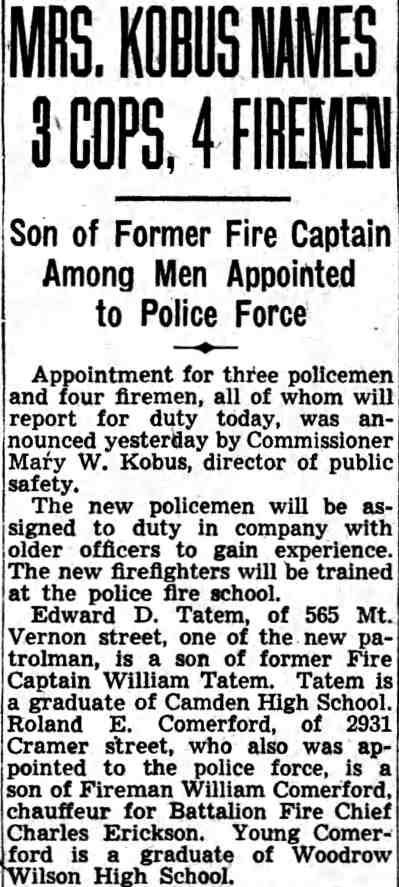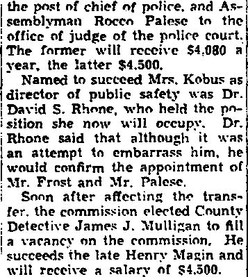 GETS WARD'S JOB AS KOBUS ORDERS COP SHAKEUP SHAW MADE ASSISTANT IN PLACE OF KOERNER In a shakeup of Camden police officials yesterday afternoon Lieutenant Samuel E. Johnson was named acting chief of detectives by Commissioner Mary W. Kobus, director of public safety. Lieutenant George A. Ward, who has been in charge of the detective bureau for a year, was transferred to take Johnson's place in charge of headquarters. Detective Louis Shaw was made assistant to Johnson, replacing Detective Sergeant Gus Koerner. Koerner was transferred to the Second District, for radio car and street duty. The new order became effective at 4:00 PM yesterday Police Chief Arthur Colsey announced the changes in the bureau after a two-hour conference with Commissioner Kobus yesterday afternoon. Maurice Di Nicuolo, who has been an acting detective, was transferred to the First Police District, with former Acting Detective Clifford Del Rossi returning to his old post in the detective bureau. In the only other transfer announced, Sergeant Harry Newton was switched from the First Police District to the Third, with Sergeant Edward Carroll going from the Third to the First. Although no other changes were made public, it is believed yesterday’s are a forerunner of numerous shifts to be made today or early next week.’ “These changes are being made for the good of the service,” Commissioner Kobus declared. “There will be other transfers of officers and men so that all the police may familiarize themselves with all the branches of the department.” Lieutenant Johnson was a appointed a policeman on January 1, 1910. After 10 years as a patrolman, he was promoted to a detective, where he made a splendid record. On November 28, 1928 he was made a sergeant, and again promoted on April 8, 1930, when he became a lieutenant. Ward was appointed a policeman on August 2, 1917, promoted to detective January 1, 1927, sergeant November 14, 1928 and lieutenant on January 24, 1930. Johnson was a detective sergeant when former Police Chief John W. Golden was head of that bureau, but later was transferred to police headquarters. Ward has been in and out of the detective bureau several times. He served for a time as the commander of the First District and later was ion charge of the police headquarters on the 12:00 midnight to 8:00 AM shift. He was a political lieutenant of former Public Safety Director David S. Rhone. |