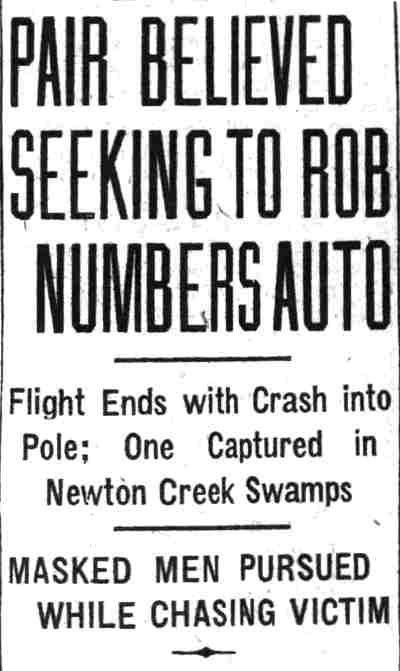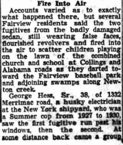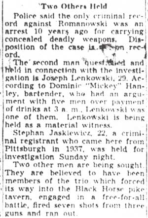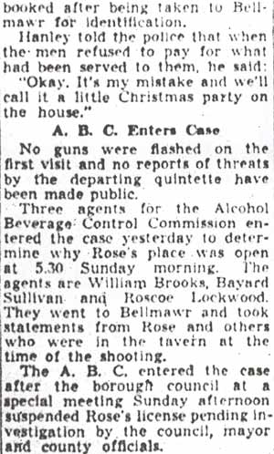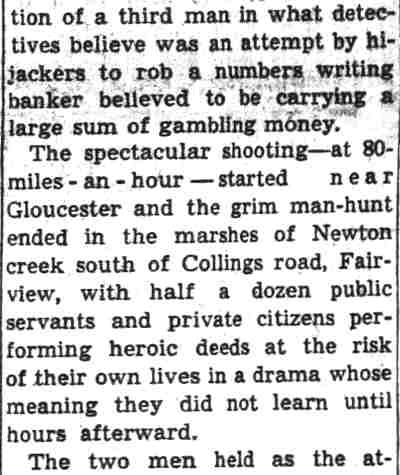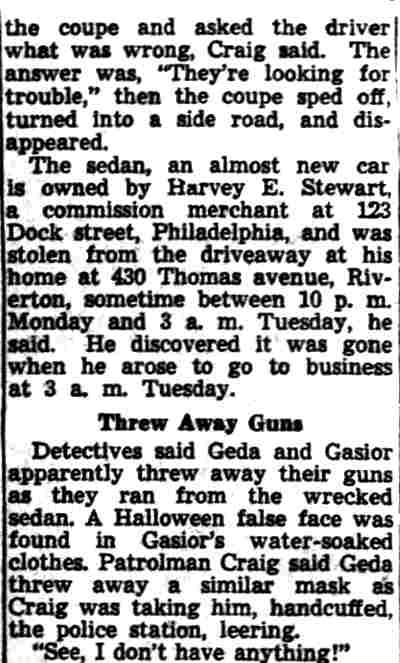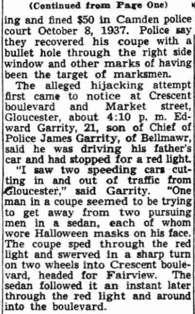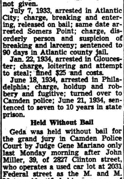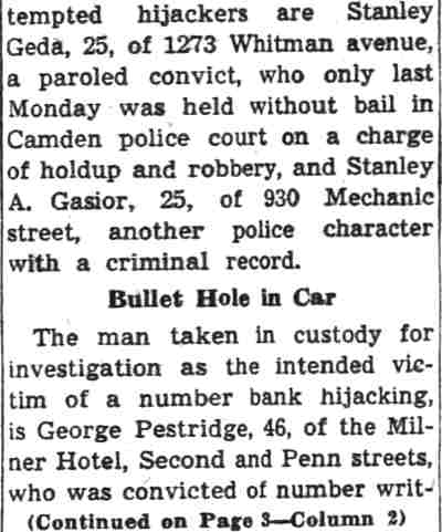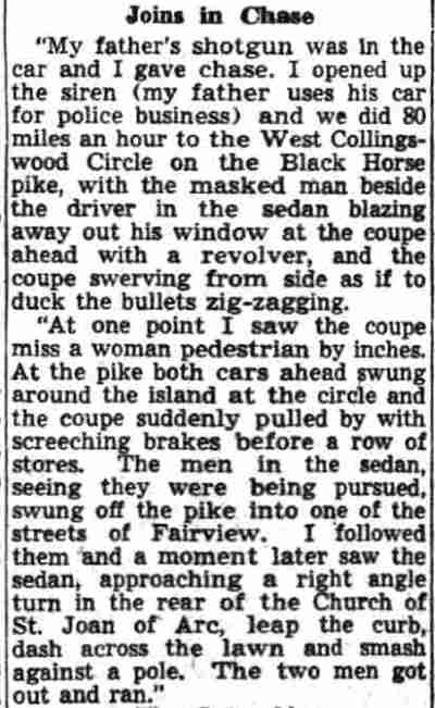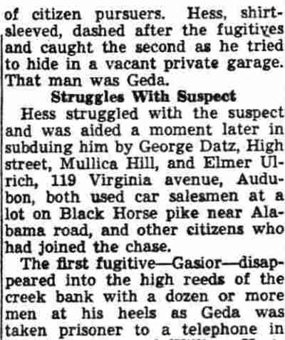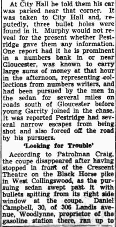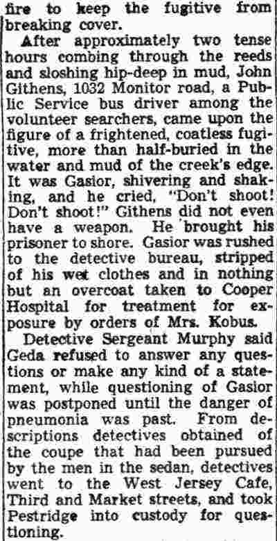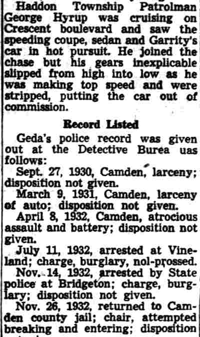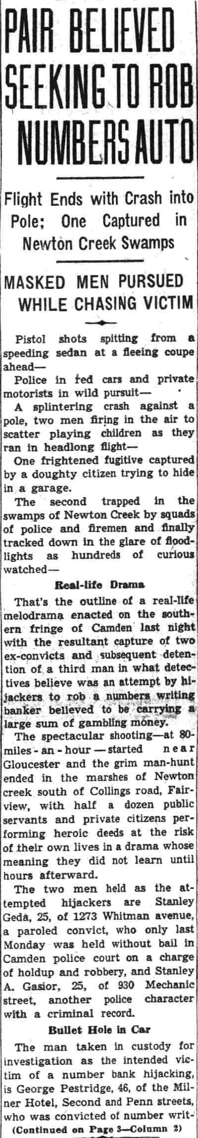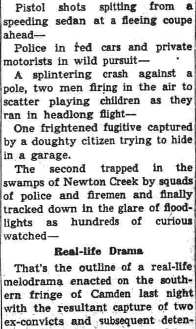 Four men were arrested amid revolver shots after a Camden policeman was knocked down by a police car during a raid yesterday afternoon. Acting on orders of Commissioner Mary W. Kobus, who is continuing her drive to rid the city of speakeasies, three policemen and two detectives surrounded the home of James Ford, colored, at 1124 South Ninth street, shortly. before 3 p. m. Patrolmen Edward Shapiro and Thomas Kauffman arrived in a radio car. So did James Brown and John Houston, two colored detectives. Patrolman Earl Stopfer arrived on foot. Three policemen went to the back door. Kauffman stayed in the radio car at the front. Shapiro knocked at the front door. The policemen at the rear were ahead of those opt front. As a re-sult four men ran out through the front door .and bowled over Shapiro. The man in the lead, who later was identified as Wilbur "Lackey" Davis, of 821 Mt. Vernon street, raced up the street, a quart bottle of liquor in hand. Kauffman had driven his radio car behind another machine. He started the engine and attempted to back out to give chase. Shapiro ran behind the car and as he did, the machine struck him, knocking him into the middle of the street. Prone, Shapiro drew his revolver and opened fire on Davis. Three shots were fired in the air. Two others were closer to the fugitive, who halted. With the sound of shooting, the other three men yielded to the assembled policemen. They gave their names as Ford, Herman Hopkins, 21, of 1124 South Ninth street, and Harry McLane, 29, of 746 Kaighn avenue. All will be arraigned today. Ford, Hopkins and McLane will be charged with violating the state A.B.C. act. In addition, Davis will be charged with resisting arrest. Patrolman shapiro was hurt but slightly. |