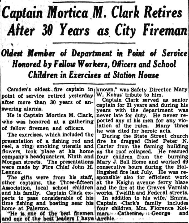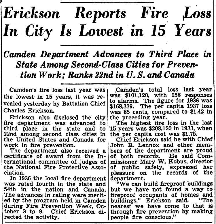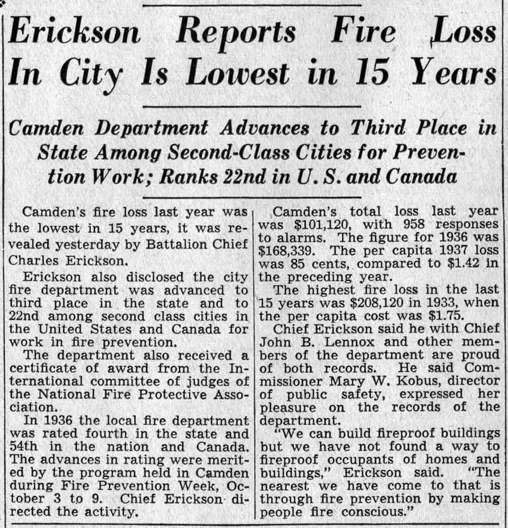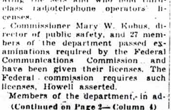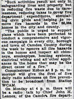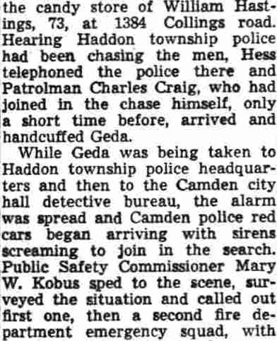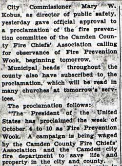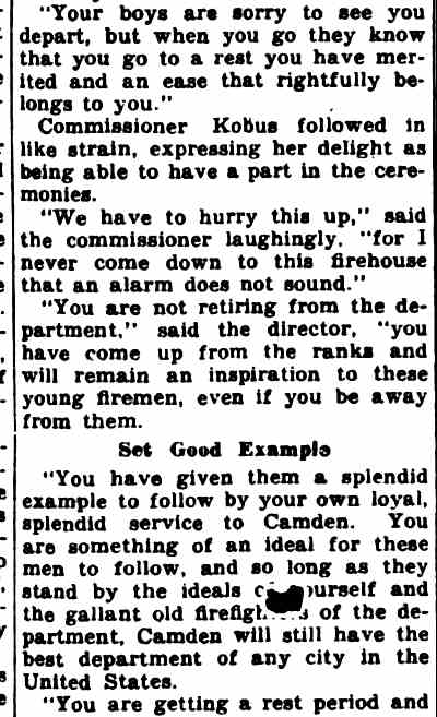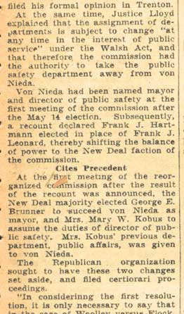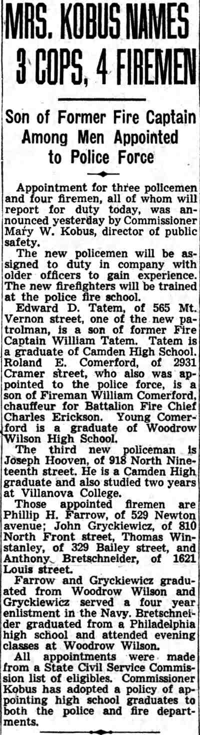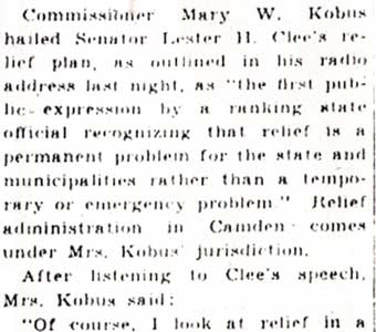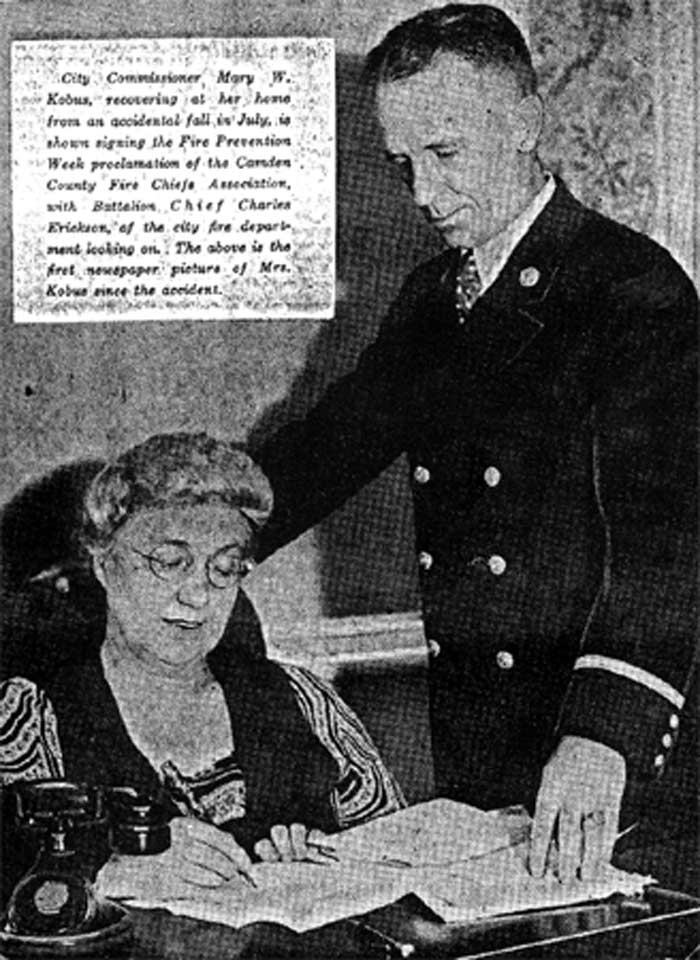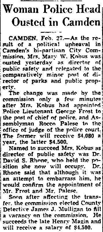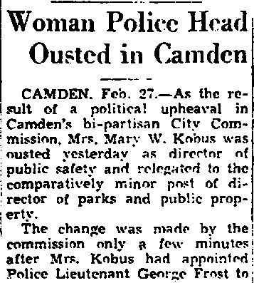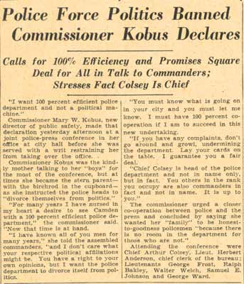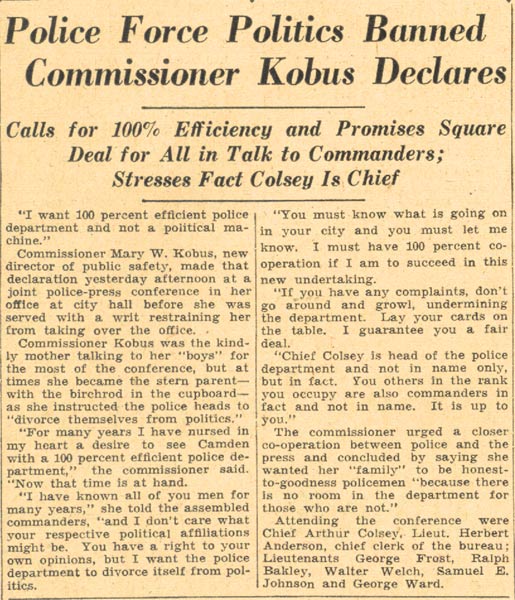 FORCE POLITICS BANNED COMMISSIONER KOBUS DECLARES “I want 100% efficient police department and not a political machine.” Commissioner Mary W. Kobus, new director of public safety, made that declaration yesterday afternoon at a joint police-press conference in her office at city hall before she was served with a writ restraining her from taking that office. Commissioner Kobus was the kindly mother talking to her “boys” for the most of the conference- but at times she became the stern parent- with the birchrod in the cupboard- as she instructed the police heads to “divorce themselves from politics.” “For many years I have nursed in my heart a desire to see Camden with a 100% efficient police department”, the commissioner said. “Now that time is at hand.” “I have known all of you men for many years,” she told the assembled commanders, “and I don’t care what your respective political affiliations might be. You have a right to you opinions, but I want the police department to divorce itself from politics. . “You must know what is going on in your city and you must let me know. I must have 100 percent cooperation if I am to succeed in this new undertaking. “If you have any complaints, don’t go around and growl, undermining the department. Lay your cards on the table, I guarantee you a fair deal. “Chief colsey is head of the police department and not in name only. You others in the rank you occupy are also commanders in fact and not in name. It is up to you.” The commissioner urged a closer co-operation between police and the press and concluded by saying she wanted her “family” to be honest-to-goodness policemen “because there is no room in the department for those who are not.” Attending the conference was Chief Arthur Colsey, Lieutenant Herbert Anderson, chief clerk of the bureau; Lieutenants George Frost, Ralph Bakley, Walter Welch, Samuel E. Johnson and George Ward. |