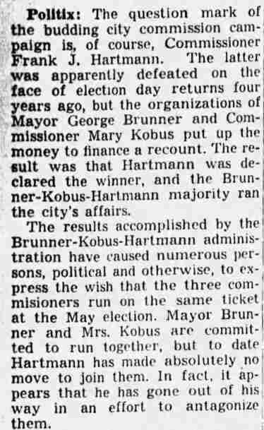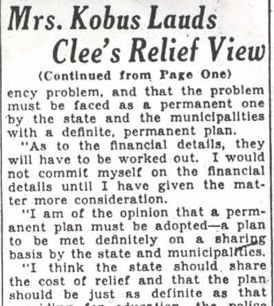 Hats 'Boss' Kobus Wears, Much Like Queen Mary's The political boss of Camden is a motherly, gray-haired woman who wears hats like those effected by Queen Mary of England. Nevertheless, and in spite of the fact that she denies it vehemently, Mrs. Mary W. Kobus, Camden's Director of Public Safety and president of its Board of Education, is one of the shrewdest politicians in New Jersey and in no small degree responsible for the victory of the "Good Government" slate in yesterday's primaries. "Naturally I'm very much pleased with the results of the election," she said today at her office in Camden City Hall. "I'm particularly pleased because it en-gendered no bitterness. Primary fights are always dangerous for that reason. The fact that there was no bitterness this time augurs well for the success of the party in the November elections." Interested in Wallace "I'm naturally interested in the career of Bruce Wallace because he's been with me ever since I entered politics and even before that." Wallace was nominated for State Senator by Mrs. Kobus' partisans . He is a member of the Delaware River Joint Commission and was a member of the South Jersey Law School class from which Mrs. Kobus was graduated in 1930. "I got interested in politics accidentally, son," she continued. All men are “son" to her. The police and firemen are her "boys," and her interest in the welfare of Camden is real and quite apart from any political ambitions she may have. The two have always seemed to jibe. Likes Welfare Work "You know I always have been interested in welfare work and people. I knew nothing of the mechanics of politics then. In 1935 there seemed to be some anxiety on the part of some people to change our form of city government. . "Now mind you, I'm not a publicity hound. I don't make good copy," she said, interrupting her-self. "If we've won this primary, it's none of my doing. It is the work of all the loyal men and women who strove so hard that made this election a success. "It seems that the women wanted some representation in city government. Specifically, they hoped to elect a Commissioner. I guess they just said eeny-meeny-miny-mo-and I was it." Since those days, Mrs. Kobus has built up a political machine that is sometimes nothing short of terrifying to the regular Republican steamroller in Camden County. It is more than coincidence, too, that her machine has benefited the city of Camden. A single instance should illustrate the shrewdness which Mrs. Kobus brings to her job. A certain fire engine had reported being at a certain spot one day. It was generally believed it was somewhere else. Mrs. Kobus went down to the fire house and poked around the truck: On the rear step she found five small stones. The stones were nothing like what was to be found in the neigh-borhood and to her they indicated one of two things- either the truck had not been cleaned for some time, or the stones had been picked up when the truck was somewhere it shouldn't have been. The firemen broke down arid confessed she was right. They got a gentle reprimand and the stones now are kept in her desk as a memento of her amateur detective work. As Director of Public Safety and President of the Board of Education, Mrs. Kobus controls the police and fire departments, the city clerk's office, police court, the excise board, the municipal motor transportation bureau, the detective bureau and the bureau of charities. She is chairman of the police and firemen's pension funds and is also fire marshal. She is also regent of the Cam-den District Parochial Parent Teachers Association and once taught school. She is a member of the Business and Professional Women's Club. She is, as well, the only woman member of the Inter-national Association of Police Chiefs and attends all of the association's conventions. Mrs. Kobus was one of the five original organizers of the Camden County Chapter of the American Red Cross and she is a member of the board of directors of West Jersey Homeopathic Hospital. Handled Strike She is famous for her handling of the strike at the New York Shipbuilding Company yards several years ago. During the disastrous Hollingshead fire, she got no sleep for almost 72 hours. She was not merely on the scene, directing activities, but she administered first aid personally, visited the homes of victims and tore around in a frenzy of activity that soon had the rescue work well organized. She is particularly proud of the fact that her popularity enabled her to bring aid from as far as Harrisburg. Mrs. Kobus' day begins at 9 A. M. It should end at 5 P. M. It never does. , Mrs. Kobus' father was one of Camden's original settlers. He ran a coal yard. Her husband owned one of Camden's first shoe stores. He died two years ago. She now lives with a sister, Mrs. Anna Connor, at 429 Haddon Avenue For relaxation Mrs. Kobus goes in for movie photography. |