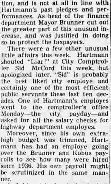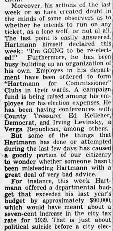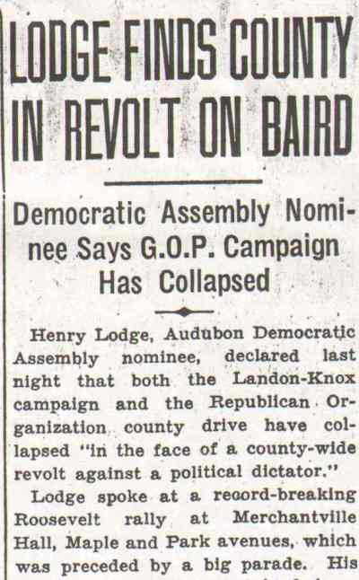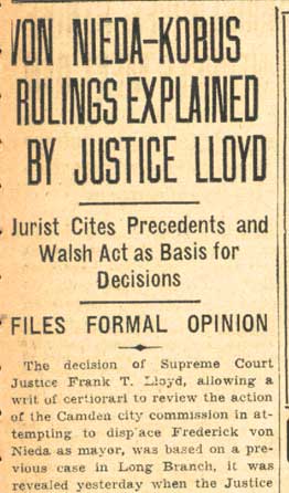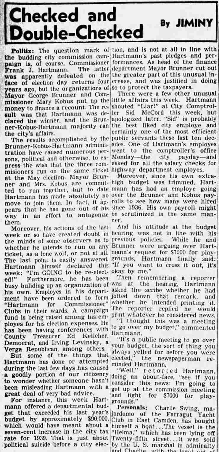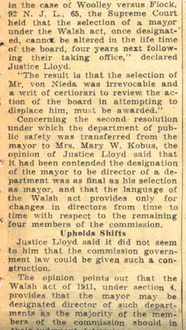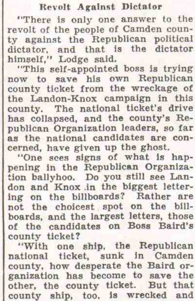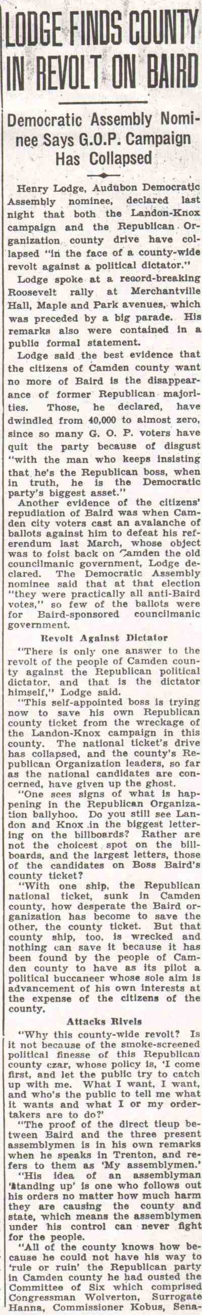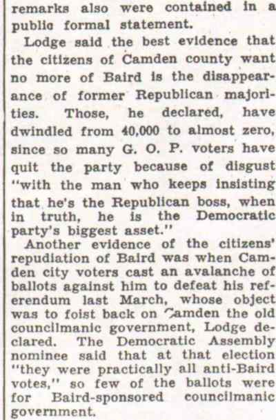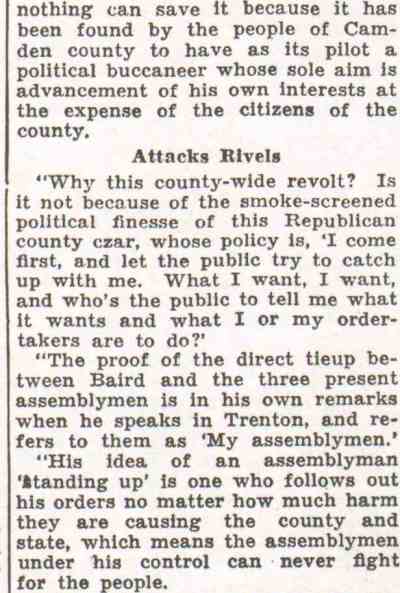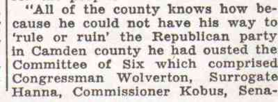 BLOCKS COUP An attempted coup by David Baird in his drive to rebuild his fallen fences for the primary election next May was frustrated yesterday by one lone freeholder, and the baby member of the board, at that. Edmund A. Walsh elected from Camden's Eighth Ward to fill the unexpired term of the late Ferdinand J. Larkin, foiled Baird's well laid plans when he refused to attend the annual organization meeting after the Republican League bloc of freeholders had been maneuvered into a position of agreeing to support James W. Wood, Baird satellite, for director.. A spokesman for the League group said the agreement was nullified, however, by yesterday's adjournment. Walsh's loyalty to City Commissioner Mary W. Kobus, long-time political foe of Baird, had the effect of stalemating the 1940 organization, the last under the large board, since the Democrats, upon learning of the G.O.P. decision to support Wood, bolted the meeting room. "Refused to Sell Out" Walsh took the stand that to vote for Wood would be to sell out to Baird. Walsh was ready and willing to vote for any other Republican. At no time was he for a Democrat.. The 20 Republican freeholders present could have transacted business and elected Wood if they had gone into session, but Walsh's refusal to be a party to the Baird-Wood scheme left only 19 freeholders willing to meet, and that number is one short of the quorum required by law. When shortly after 5:00 PM- five hours after the statutory time for reorganization- there was no indication that wither Walsh or the Democrats would return. Wood, J. Alfred Beck, president of the Republican league, and Maurice Bart, floor leader for the Democrats, conferred and agreed to adjourn until next Monday. Price Furnishes Surprise Walsh emphasized that he favors Republican organization of the board and agreed to support any Republican for director except Wood. These are the sentiments of Mrs. Kobus. Too, it was the stand of the Republican League until at yesterday's joint conference of the three G.O.P. factions the group headed by Raymond G. Price cast its lot with Wood. This in itself was a major surprise of the day, since Price and Edward J. Quinlan both elected with Kobus support had been considered anti-Baird-ites. |