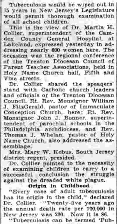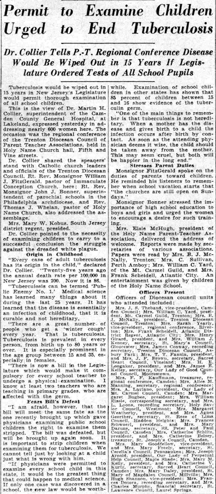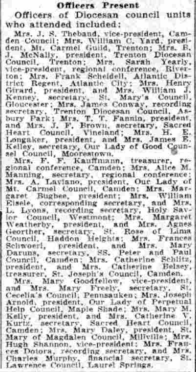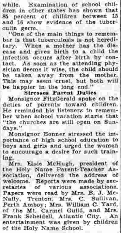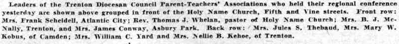 Point Pleasant, June 8- Mrs. Mary W. Kobus, of Camden, South Jersey district regent, was one of the principal speakers today at the quarterly meeting of the Amboy District, Diocesan Parent-Teacher Association, in St. Peter's Church. More than 300 attended. Other speakers included Rev. Father Reilly, rector of St. Catherine's Church, Spring Lake, and chancellor of the Trenton Diocese; Rev. Michael Dalton, diocesan superintendent of schools, and Rev. Father Adolph, O.M.C., rector of St. Peter's Church. |
