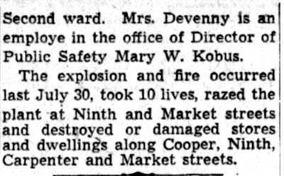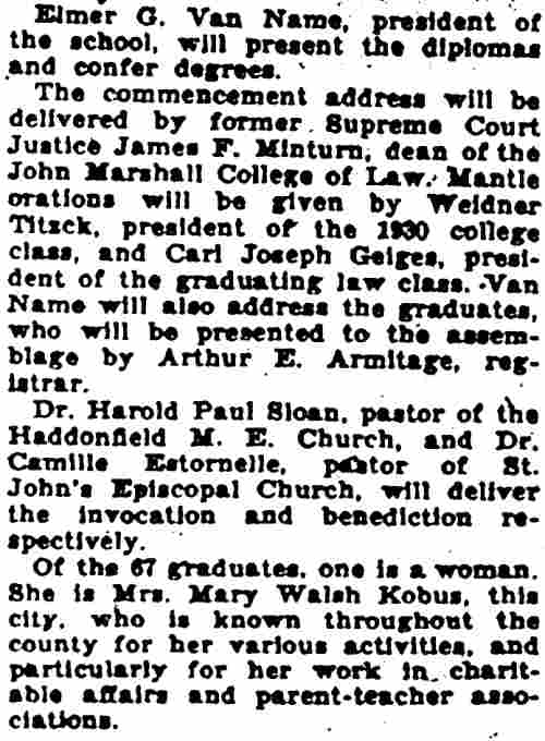MARY WALSH KOBUS was one of the first female politicians to rise to prominence in Camden NJ. Born Mary Walsh in New Jersey around 1876, she married well known Camden businessman Joseph Kobus around 1910, and was the daughter-in-law of Anthony Kobus, who founded the Kobus shoe business and also served as president of the the Broadway Trust Bank at Broadway and Walnut Streets. After women won the right to vote, Mary Kobus involved herself in politics. She also studied law, and was the only female graduate in 1930 from the South Jersey Law School, now a part of Rutgers University, in Camden NJ. Mary Kobus was elected to the City Commission on May 1, 1935. She was a Democrat and a political ally of George M. Brunner, who served as Mayor of Camden from 1935 through 1959. When a recount added Frank Hartmann Jr. to the Commission, the balance of power shifted, and Mary Kobus was named director of public safety, and George Brunner replaced Frederick Von Nieda as mayor. Von Nieda sued to keep his position, but his suit was rejected in the New Jersey State Supreme Court. Mary Kobus and her husband, Joseph Kobus, lived at 429 Haddon Avenue in Camden. Joseph Kobus passed away in June of 1939. Mary Kobus continued to serve in Camden city government after his passing. |