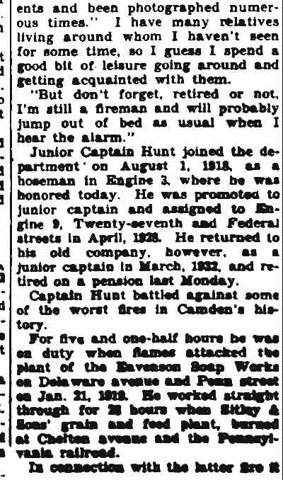 Funeral services for City Commissioner Henry Magin were held Tuesday, with many officials and colleagues in veteran's and fraternal circles participating. Commissioner Magin, who was 44, and head of the Public Works Department of Camden, died suddenly Friday, just as he had finished talking to an official. As he fell he was caught in the arms of James Carr, of the Highway Department. Services were conducted in the city commission chambers of the City Hall, and were in the charge of Rev. Dr. W. W. Ridgeway, pastor of St. Wilfred's Episcopal Church, Westfield Avenue and Dudley Streets, East Camden. Fully 8,000 persons viewed the remains Monday night as the body lay in state in the City Hall, and Mayor Brunner gave a half holiday to all city employees so they could attend the funeral service. Magin was a veteran of the World War and was injured during action on the other side. The casket was carried by war veteran associates of the public works director, who died from a heart attack Friday. A color guard from the Veterans of Foreign Wars and the American Legion preceded the casket, followed by the four remaining members of the city commission, Mayor George E. Brunner and Commissioners E. George Aaron, Mrs. Mary W. Kobus and David S. Rhone. A guard of honor lined both sides of City Hall steps, 22 policemen on one side and 22 firemen on the other, representing Magin's age, 44 years. Interment was made in the National Cemetery, at Beverly, N.J. Harry Leonard, 2750 Federal Street, had charge of the funeral.. |