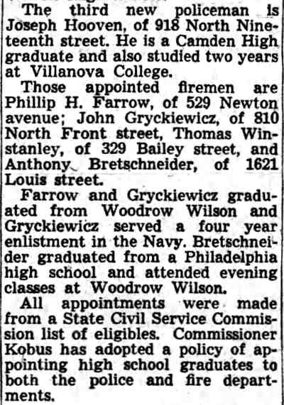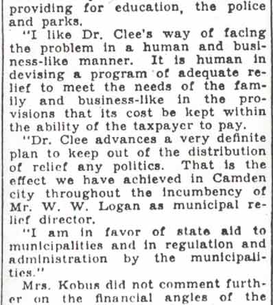 The State Civil Service Commission has been requested to authorize appointment of a staff physician for the Camden City department of public works at an annual salary of $1500, and Dr. Maurice E. Baker has been named to the post on an ad interim appointment by Commissioner Frank J. Hartmann, Jr. Dr. Baker, a Democrat, was a candidate for city commissioner last May on the New Deal-Non Partisan ticket, which elected hartmann and Commissioners Mary W. Kobus and George E. Brunner. hartmann said last night that Dr. Baker has been acting as staff physician for the past four days and has made 12 examinations. Some of these, Hartmann said, were for city employees with frost-bitten toes, fingers and ears, who are claiming compensation, and one was of a woman who slipped and fell on a sidewalk. "dr. baker, of course, is not getting paid a salary now," Hartmann said, "but we hope he can be placed on a salary as a money-saving movement. "Heretofore the physicians examining city workmen on compensation claims have charged the city $10 for each examination. "I expect dr. baker to make 600 to 700 calls a year, most of them examinations, and thus get the work, done for $2 in each case. "I expect also to save money on compensation claims by having dr. baker make examinations of any new men hired, so that we may be sure they are in good physical condition. As it is a man could receive an injury somewhere else, go to work for the city and then claim compensation for the injury by pretending it happened on the city job. "Dr. Baker's examinations of the present employees will lead to compensation claim savings also, as we will be in position to make some of these men take steps to protect themselves and the city, where remedial action seems necessary." Hartmann said all members of the city commission except Mayor frederick von nieda have endorsed the employment of a staff physician. "I haven't had a chance to talk to the mayor about it yet," Hartmann said. City Solicitor E. G. C. Bleakly also has approved the move as offering a chance to save money, Hartmann said. |