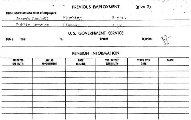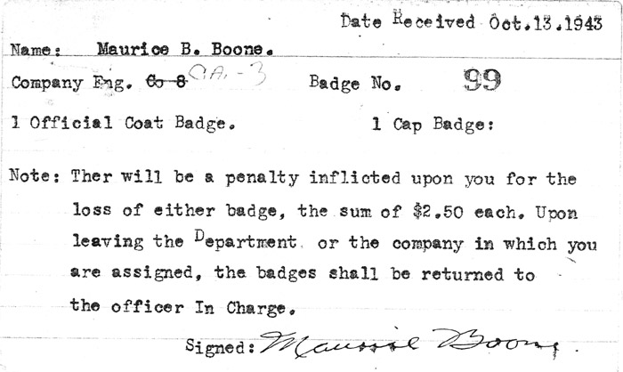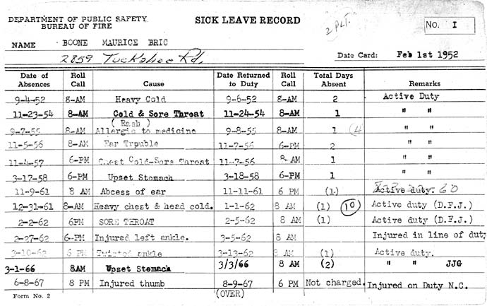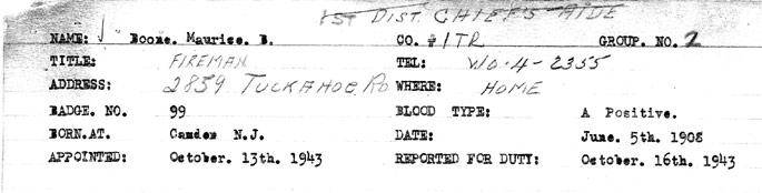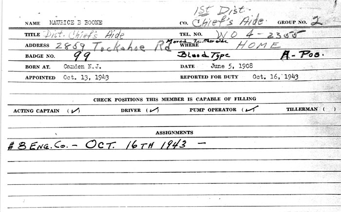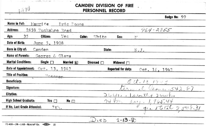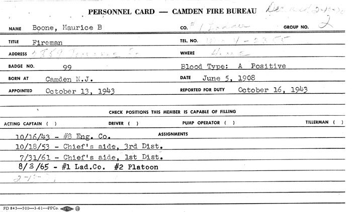 MAURICE BRIC BOONE was born in Camden, New Jersey on June 5, 1908 to George C. Boone and his wife, the former Clara Clayton. He was the third of four children, all boys, born to the couple. His grandfather was James G. Boone, who had served as a sergeant in the Union Army during the Civil War. The 1900 census shows that George C. Boone and his younger brother J. Frank Boone were living with their parents at 558 Line Street. Older brother Walter Boone had moved out on his own. Both of the younger Boone sons were then working for the Pennsylvania Railroad, George as a brakeman, J. Frank as a fireman. James G. Boone had died in 1902. George C. Boone married Clara Clayton, of 605 Mt. Vernon Street, around 1903. Her brother, George Clayton, was a well-known baseball player in Camden. By the time the 1906 Camden City Directory was compiled, George C. Boone and his wife and oldest son George L. Boone were living at 630 Mt. Vernon Street. His widowed mother remained on Line Street with her youngest son, J. Frank Boone. Mrs. Achsahann "Annie" Boone died in 1923. George C. Boone was still working as a railroad brakeman when the Census was taken on April 19, 1910. He and wife Clara Clayton Boone were living at 630 Mt. Vernon Street with their four sons, George L., 6; Harry, 4; Maurice, 3; and Charles Howard Boone, 1. Maurice was named after Reverend Maurice Bric, who served as pastor of the Roman Catholic Church of Sacred Heart at Broadway and Ferry Avenue from 1888 through 1913. On July 1, 1910 George C. Boone was appointed to the Camden Fire Department and assigned to Engine Company 7 at 1115 Kaighn Avenue. Sadly, Clara Boone died during the 1910s, leaving her husband to care for the four young boys. George C. Boone had moved in with his wife's family, the Claytons, at 605 Mt. Vernon Street by the time the 1914 City Directory was compiled, and was still living there in September of 1918 when he registered for the draft. 605 Mt. Vernon Street was the home of his widowed mother-in-law, Susan Clayton and two of her adult children, Angela and John. George C. Boone and his three older sons resided at that address when the census was taken in 1920. His sons spent time with different relatives, Harry and and C. Howard Boone went to their Aunt Mary Boone Colgan's home at 1017 South 5th Street while quite young, Maurice spent most of his years with his Aunt Angela, while George spent time with relatives named Gallagher. By 1920, George C. Boone and his three older sons were under one roof, at 605 Mt. Vernon Street, while C. Howard remained with the Colgans on South 5th Street. George C. Boone was serving with Engine Company 2 when he was injured while fighting a fire on January 19, 1922. Captain Martin Carrigan died in the line of duty of injuries sustained while fighting this fire. Not long afterwards, George C. Boone had remarried. It turns out that George C. Boone married "the girl next door". Next door, in this case being 1117 Kaighn Avenue, adjacent to Engine Company 7's headquarters. There lived a widow, Laura Wasserman and her daughter Edna. By 1924 George C. Boone and Laura Wasserman had married and soon moved to Parkside, where by 1924 they bought a house at 1013 Princess Avenue. Laura's daughter Edna lived with them, while the Boone sons- George L., Harry, and Maurice B. Boone remained with their aunt Angela and uncle John Clayton at 605 Mt. Vernon Street, and C. Howard Boone on South 5th Street. Maurice Boone after leaving school to enter the workforce apprenticed as a plumber with his cousin, Francis Colgan, and remained in his employ until 1934. He quit after discovering that his uncle had failed to turn over to the Internal Revenue Service moneys deducted for Social Security. Maurice Boone then went to work for another plumber, Joseph Barnett. Maurice Boone stayed with Barnett for eight years before leaving to take a job with the Public Service Gas and Electric Company as a plumber. Meanwhile, on December 22, 1930 brother George L. Boone was appointed to the Camden Fire Department, joining his father. George C. Boone signed his pension papers on November 22, 1938. Unfortunately, within two weeks he had died, on December 4, 1938. In January of 1943 Maurice B. Boone and his step-sister Edna Wasserman, who had been raised not only in separate houses but in separate neighborhoods, wed. Maurice and Edna Boone made their home at 1013 Princess Avenue into the late 1940s. The Boones moved to 2859 Tuckahoe Road in Fairview in 1952. Maurice Boone was appointed to the Camden Fire Department on October 13, 1943, assigned Badge #99, and was assigned to Engine Company 8 at 619 Kaighn Avenue . On October 18, 1953 he was made Chief's Aide in the 3rd Fire District. He held this post until July 31, 1961, when given a similar assignment in the 1st Fire District. He was also qualified to serve as Acting Captain but was never permanently assigned in this capacity. On February 27, 1962 Maurice Boone injured his left ankle while fighting a fire. He returned to work on March 5, but re-injured the ankle on March 10, missing an additional 3 days work. On August 3, 1965 Maurice Boone was assigned to Ladder Company #1, which then operated out of Fire Headquarters at North 5th and Arch Streets. On August 9, 1967 he injured a thumb while on duty. He broke his left wrist fighting a fire on February 23, 1968. Maurice Boone was scheduled to retire from the Camden Fire department on February 23, 1970. Before he had a chance to enjoy his retirement, he passed, dying on February 14, 1968. He was survived by his wife, brothers C. Howard and George, and two sons, David and Michael. David Boone, son of Maurice and Edna Boone and the grandson of George C. Boone, is a marine artist, known for his paintings of tugboats and waterfront scenes. Maurice Boone's uncle, George Clayton, was appointed to the Camden Police Department in 1918. He served until his death in 1947, having reached the rank of Captain. |