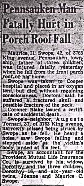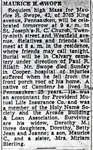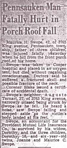 MAURICE H. SWOPE was the son of Charles Swope Jr. and Anna Husman Swope. His grandfather, Charles Swope Sr., for many years owned a marble monument business in Camden, and at one time been a member of the Camden Fire Department. Maurice Swope's father was a painter. He was killed when he fell from scaffolding in 1916. Tragically, Maurice Swope also lost his life when he fell from the front porch roof of his home on April 20, 1949. |
