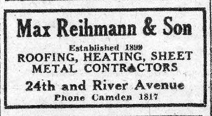MAX FREDERICK REIHMANN SR. Both sons, Paul Riehmann and Max Riehmann Jr. went into the roofing business after Max Riehmann retired. Max Riehmann Jr. was active in the fund raising drive in the 1920s that culminated in the building of the Walt Whitman Hotel at Broadway and Cooper Street, and with the Lions Club in Camden during the 1930s. |