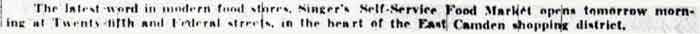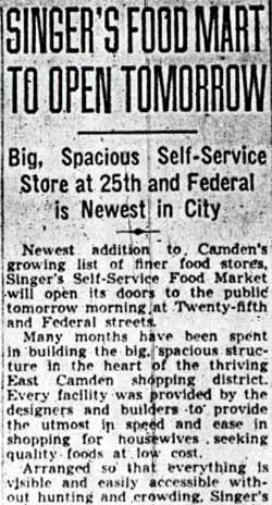 MAX M. SINGER operated grocery stores at different locations in Camden from the 1930s through the 1960s, primarily on or near Kaighn Avenue. Born December 14, 1893, Max Singer came to Camden after the census of 1930. The 1936 New Jersey Bell Telephone Directory shows that he had a grocery at 1206 haddon avenue, and resided at 1501 baird boulevard in camden's Parkside neighborhood. 1206 haddon avenue was later the home of Albert Berul's music school and appliance store, and has been the site of Lori's Records and Tapes since the 1980s. By February of 1938 he had a store at 512 Kaighn Avenue, as well as one in Mt. Holly, New Jersey. On January 25, 1940 Max Singer opened Singer's Self Service Food Market in the 2400 block of Federal Street. His large market was an intermediate step between the traditional corner stores, and the supermarkets which would became prevalent after World War II. The 1947 Camden City Directory shows that Max M. and Sophie Singer were living at 1249 magnolia avenue in Parkside, an address he was still living at in the fall of 1963. He was still operating the grocery at 512 Kaighn Avenue. A Benjamin Singer was working as clerk at the store, this appears to have been a younger brother. Max Singer would return his business to Parkside, as the 1956 and 1959 New Jersey Bell Telephone Directories show his business at 1301 Kaighn Avenue, in the same block as his 1936 location on Haddon Avenue. Max Singer passed away in December of 1966. His business was taken over by William Bezhaler. |