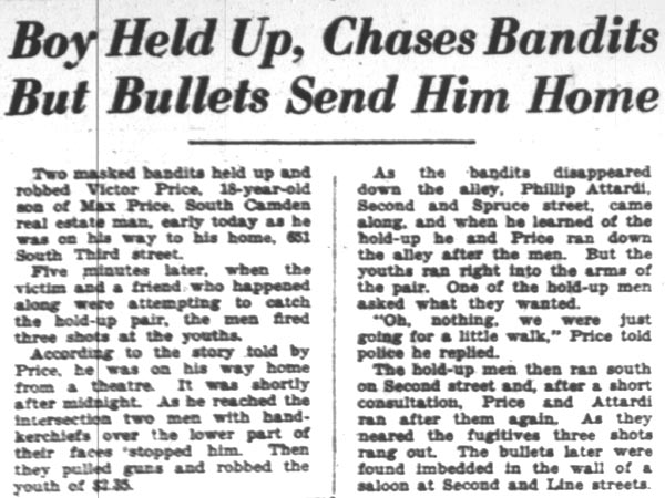 MAX PRICE was born in Russia around 1887. He came to America in 1902, as did his wife Rose. The wed around 1908, and lived in Pennsylvania for the first few years of their marriage, where sons Victor, Raphael, and daughter Mollie were born. By 1917 the family had come to Camden, and four children followed, Anna, Samuel, Abraham, and Aaron. The family lived at 814 South 3rd Street when the census was taken in January of 1920. By February of 1928 they had moved to 651 South 3rd Street, where they were living at the time of the April 1930 Census. Sadly, Raphael Price was lost during the 1920s. Max Price was a paperhanger by trade, and had his own shop by 1920. Son Victor joined him in the late 1920s, as did the other sons as they came of age, and the firm became known as M. Price and Sons. He also appears to have had real estate interests as well. The 1936 New Jersey Bell Telephone Directory shows him living at 666 South 2nd Street. The Price family was living at 1204-1/2 Kaighn Avenue by 1947, save Victor who had married and moved to 1232 Kenwood Avenue with his wife Mollie. Tragedy struck again during World War II son Abraham Price was killed in action while serving with the United States Merchant Marine. News accounts of this incident show the Max Price family at 1255 Kaighn Avenue. By 1956 Max Price had left Camden. In the fall of 1956 he was living at 2458 46th Street in Pennsauken. The 1959 Bell Telephone Directory shows the sons had moved to Haddon Township, and that the business was by then located at 1375 Walnut Street in Camden. By 1970 the business was no longer listed in the telephone directory. |