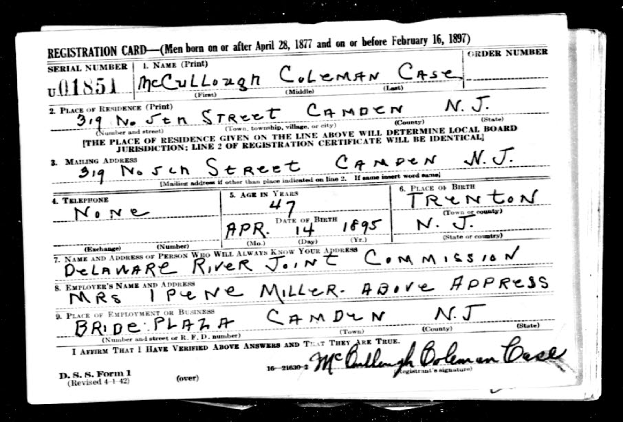 MCCULLOUGH COLEMAN CASE was born in Trenton, New Jersey on April 14, 1894. After serving in World War I he married. He worked as a policeman for the Delaware Valley Bridge Commission, the forerunner of the Delaware River Port Authority, as early as 1929, and was still working in that capacity as late as 1947. McCullough Case was living in Laurel Springs when the 1929 City Directory was compiled. When the census was taken in 1930 he and wife Lyndall were living on Washington Avenue in Laurel Springs with their children Richard and Warren. McCullough Case had moved to 319 North 5th Street, near his job, by 1942. However, the 1947 Directory does not list him, nor do Camden County telephone directories in 1956 or 1959. In later years he returned to Trenton, where he died in November of 1979. 1979. |