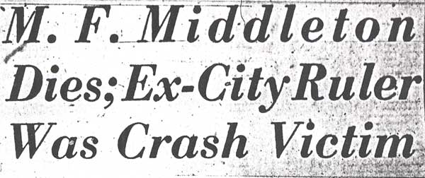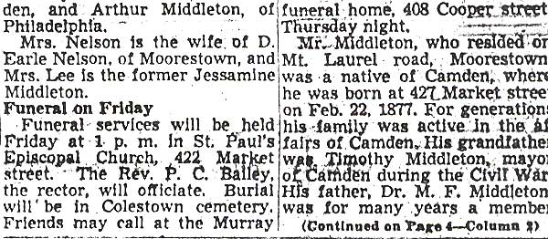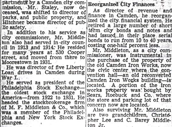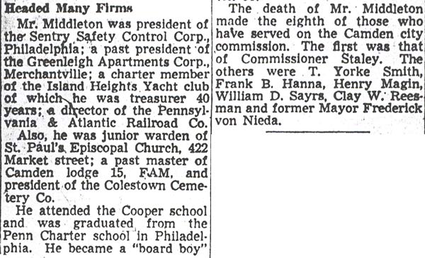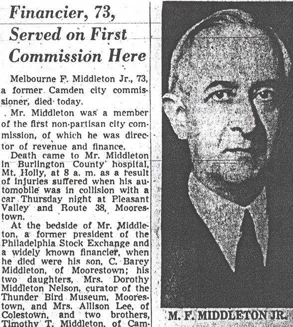 Middleton Felled by Gas In House Here With gas flowing from a pipe detached from a gas range, former City Commissioner Melbourne F. Middleton, Jr., was found unconscious in the kitchen of his former home at 538 Cooper street early Saturday night. Middleton was reported last night to still be in a critical condition at West Jersey Hospital, where he was taken. The Camden Fire Department First Aid Squad worked over him for an hour at the house in a vain effort to revive him. Middleton, a former president of the Philadelphia Stock Exchange, and one time city councilman, was found by a son, C. Barry Middleton, and a friend, John Williams Rossell, who lives with the Middletons on Laurel road, Moorestown. Middleton was clad in overalls and two large pipe wrenches were lying on the kitchen floor near him. Young Middleton said his father told his family he intended to take up some linoleum in the kitchen of his former home. Middleton first went to his office Saturday and then to St. Paul's Episcopal Church to a service. From there he was traced to his former home, which is owned by him. When Middleton failed to return home for dinner at the usual time Saturday his son and Rossell decided to search for him. When young Middleton discovered his father's plight he notified police. Patrolmen Frank Cavallo, Henry Lutz, Walter Vecander and George G etley responded in radio cars and gave first aid until the fire department squad arrived. The firemen worked on the former commissioner one hour with an inhalator before ordering his removal to the hospital, where they continued to work on Middleton for another hour but were unable to revive him. Hospital physicians continued working on him without success. They said his condition was critical. Gas Man Called At 4 p. m. Saturday the family living next to Middlemen's home telephoned Public Service that gas was coming from the house. Public Service sent a man to investi-gate but he was unable to get into the house. Young Middleton and Rossell said they reached the house at 6.17 p. m. While he was a member of the first city commission Middleton was director of finance but never missed responding to all alarms of fire. He was a member of the fire committee while serving in City Council as a member from the Second ward. In that capacity he also answered all alarms. Members of the Firemen's First Aid Squad responding to the call were Deputy Chief William R. Harring, Hosemen Christopher Moll, william spencer, Harry Haines, Russell Anderson, william harry deitz and Nelson Andrews. City Detectives benjamin simon, Joseph Mardino and William Marter are investigating the cause. |