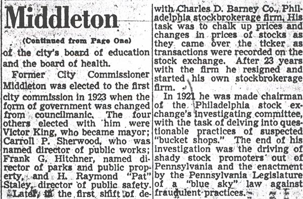 MELBOURNE FLETCHER MIDDLETON JR. was born in Camden on february 22, 1877. His grandfather, Timothy Middleton, had served as the Mayor of Camden during the Civil War. His father, Dr. Melbourne F. Middleton Sr., a prominent Camden physician, built a large house and office at 423-425 Federal Street in 1886, and this is where Melbourne Jr. spent his early years. The elder Middleton also had served as the president of the Camden Homeopathic Hospital at West and Stevens Streets, the fore-runner of West Jersey Hospital. On Ocrober 25, 1900 Melbourne F. Middleton Jr. was married to Jessamine Weatherby, of Camden NJ. At least four children came of this marriage, Melbourne Fletcher III, Dorothy, jessamine, and C. Barry Middleton. Mebourne F. Middleton's career was spent in the banking and financial services industry. In 1910 he was working for the banking firm of Charles D. Barney & Company at 124 South 4th Street in Philadelphia. This firm was the successor to the old Jay Cook firm which had provided financing to the Union during the Civil War, and still exists today as Smith-Barney. By 1916 Melbourne F. Middleton was sitting on the Board of Directors of the First National Bank of Camden, headed by David Baird Sr., longtime head of Camden County's Republican party organization. Melbourne Middleton Jr. involved himself with the civic life of Camden as a Republican. During World War I he served as chairman of the Liberty Loan Committee, which raised $38,395,150 from Camden and the surrounding area. He also was a member of the Camden County Historical Society. At the time of the 1920 census, Melbourne F. Middleton Jr. his wife Jessamine, daughters, Dorothy and Jessamine, and son C. Barry were living at 538 Cooper Street in Camden. This home was designed by noted architect Arthur Truscott in 1892. This building was turned into a seafood restaurant in the late 1930s, and has been used for professional offices for many years, up until today in 2003. In January of 1921 Melbourne F. Middleton Jr. was elected president of the Philadelphia Stock Exchange. He was re-elected president of that body at least seven consecutive times. When Camden changed its charter to the commission form of government in 1923, Melbourne F. Middleton Jr. ran for office successfully. He served as Director of Revenue and Finance during the administration of Mayor Victor King. Although endorsed, along with fellow commissioner Carroll P. Sherwood, for re-election by Camden's Non-Partisan League, his slate, which included Dr. Orris Saunders, newly appointed Judge Frank F. Neutze, and realtor Carl R. Evered, did not win, and Melbourne F. Middleton Jr. left the City Commission after the May 1927 elections. He returned to the stock brokerage business, and was still residing at the cooper street address at the time of the April 1930 census. He was still in the financial industry in the mid-1930s. Melbourne F. Middleton died on January 2, 1951 of injuries sustained in an auto accident. |
