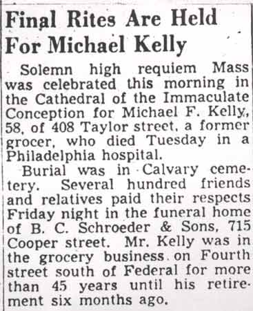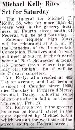 MICHAEL KELLY was born in Pennsylvania around 1891. His family moved to Camden in 1900. He soon found work at a grocery store operated by Michael Ervin at 11 South 4th Street. He remained in the grocery business for 45 years, retiring in the fall of 1949. At the time of the April 1930 census he was living at 408 Taylor Avenue in Camden, and owned his grocery, Kelly's Food Store, at 11 South 4th Street. Younger brother John J. also worked in the store, while older brother Joseph owned the Taylor Avenue home. A few months after he retired, he was injured at a fall at home. Taken to the Fitzgerald-Mercy Hospital in Darby PA, he passed away on February 28, 1950. Michael Kelly had made many friends in his 45 year career as a grocer. Several hundred friends and relatives came to his funeral at the Church of the Immaculate Conception in Camden. He was buried at Calvary Cemetery in Delaware Township (present-day Cherry Hill) NJ on March 4, 1950. |