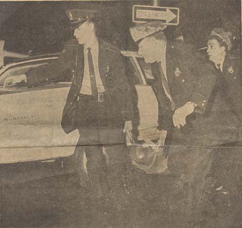 A CAMDEN patrolman is hurried to a waiting ambulance following the crash of a patrol car against a utility pole at 10th and Federal Streets last night during chase of another car. Patrolman Robert Bergman, 23, of 3148 Waldorf Avenue, the driver, and Patrolman Edward Eldred 3rd, 24, of 1014 Kenwood Avenue, were admitted to Cooper Hospital with moderate injuries. Their condition today was reported satisfactory. At far right: Officer Mike Lupico |