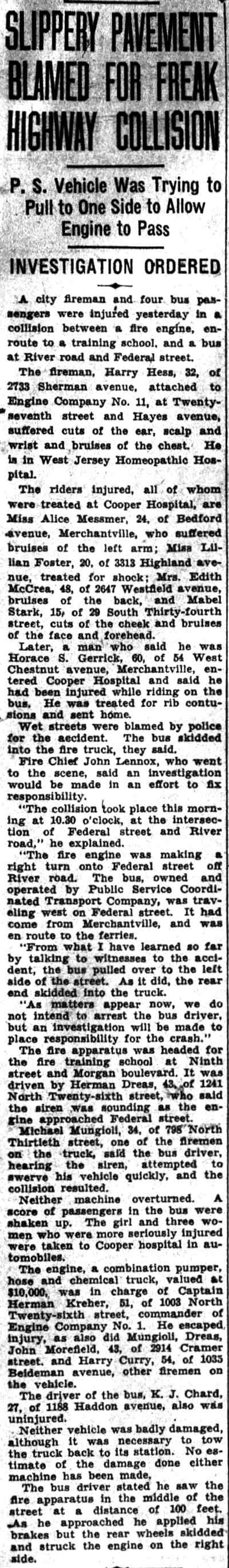 Fox Heads Affair; Drive for Members Stressed; Contribute to Red Cross Plans are being formulated for the fourth annual military ball by the Veterans of Foreign Wars to be held Armistice night, November 11. County Commander Charles B. Frank, at the meeting of the Camden County Council of the Veterans of Foreign Wars, on February 4, named Harold Paul, Fox chairman of the event. Fox, who is chief of staff of the department of New Jersey, spoke on the membership drive being staged nationally by the V. F. W. and of the benefits that have been accomplished through legislation for the veteran and his department which could not have been otherwise brought about except through the representation of the membership of the various veteran organizations, Fox said. Senior Vice Commander Conrad F. Holzermer, of the council, who is chairman of the membership drive in Camden county, appeals to all ex-service men in the city and county of Camden who served either in the Philippines, Puerto Rico, China, Mexico, Vera Cruz, France, Germany, Russia, Santo Domingo or Nicaragua to contact any post or member of the Veterans of Foreign Wars who will gladly explain the benefits he eventually derives in later years through his membership in this veteran organization. In answer to the appeal of the American Red Cross for the relief of the civilians in war-torn China, a check was mailed to the Camden County Chapter of the American Red Cross to be used for such relief. Seek Jersey as Ship Name Capt. H. G. Sparrow All-Navy Ship No. 1269—At the meeting Tuesday night the ship went on record supporting the request made to Congress by Congressman J. Parnell Thomas that the next battleship authorized be named the New Jersey. Due to the historical background and the fact that New Jersey is one of the 13 original colonies, it was deemed fitting that the state should receive this consideration. Letters have been forwarded, through proper channels, to that effect. Members were urged to listen in on the "Hello America" radio hour on February 28 at 11.30 p. m. Commander-in-Chief Scott P. Squyres will deliver the membership obligation over the air at approximately 12.10 and will have a message of interest for all V. F. W. members. howard h. bean and M. Mungioli, of Post No. 518, and C. Sutton and E. Gaylord from Post No. 980, attended the meeting. Horace Kershner was also present, having been discharged from Philadelphia Naval Hospital recently, after spending 17 months there. Entertainment Chairman Tom Jackson announced that a Washington's birthday party will be held at the ships quarters, 304 State street on Saturday night February 26. He also is planning an old-fashioned 'Navy Night,' the date of which will be announced later. Gross-Hollinshed