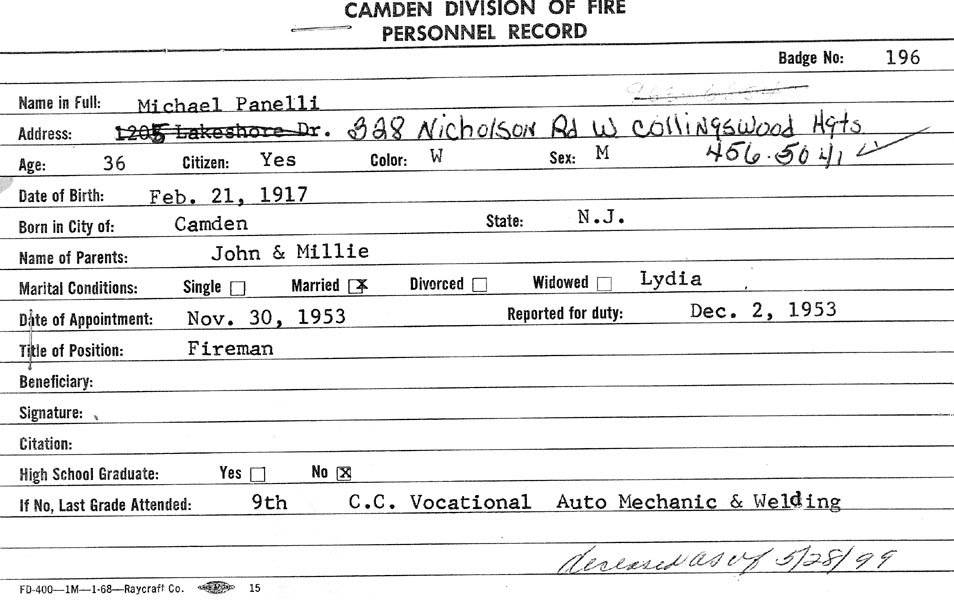 The new firemen are henry j. keating, 3316 Lemuel Avenue, transferred from the Police Department; Thomas J. McCabe, 385 Garden Avenue; Orville Goldsboro, 293 Liberty Street; Carmen Ianelli, 310 Berkley Street; Michael Panelli, 802 South 6th Street, and Harrison W. MacNeir. 29 South 35th Street.