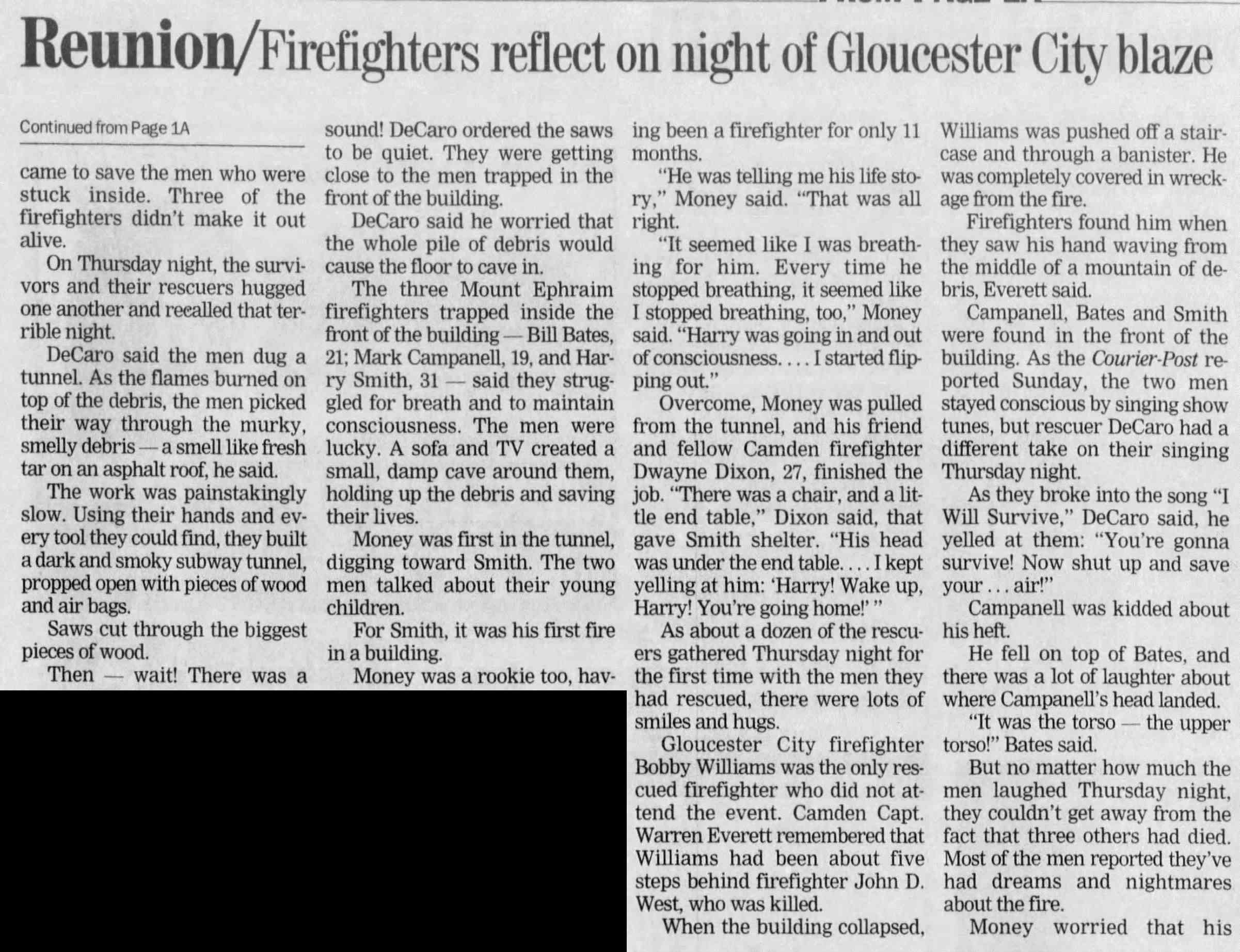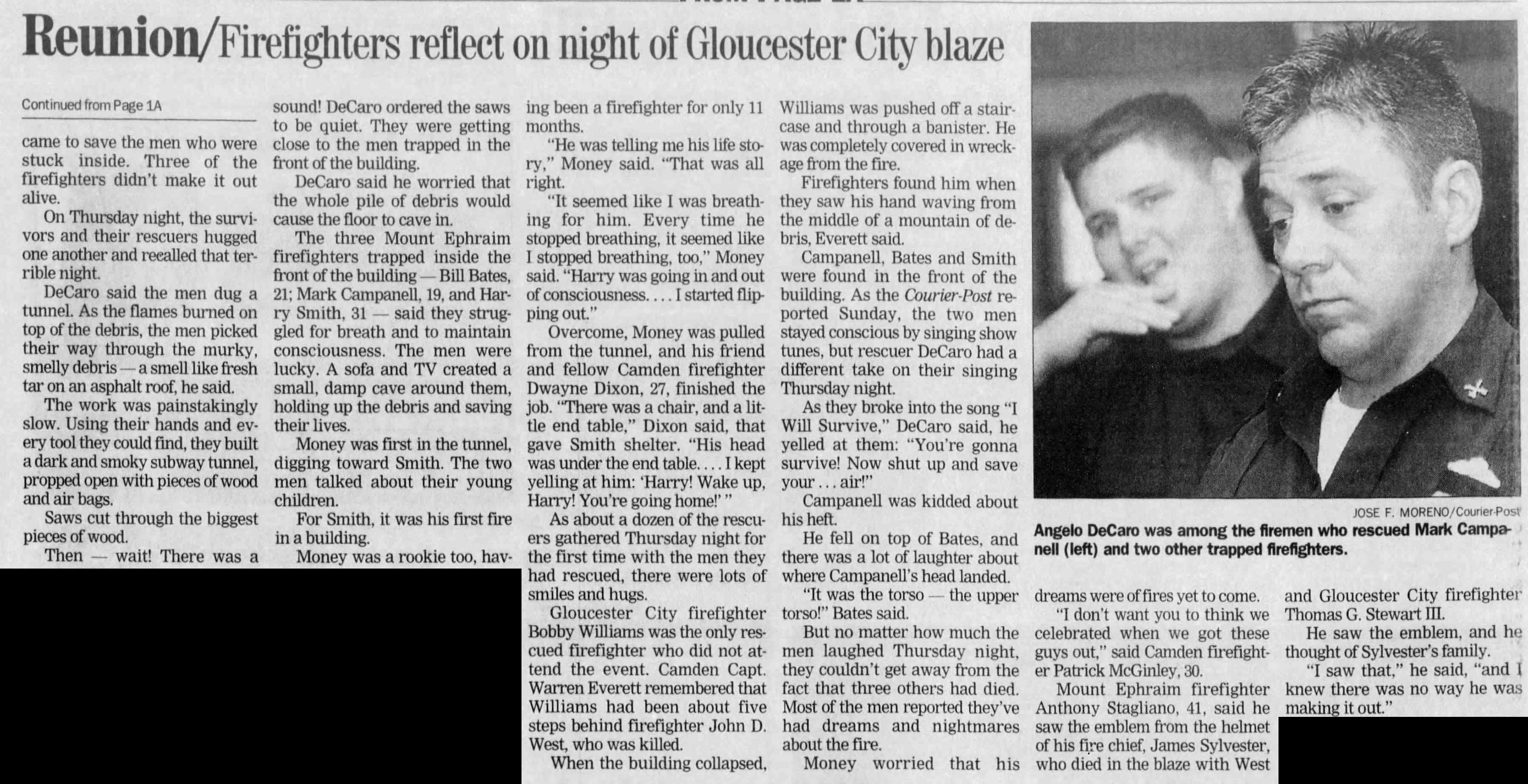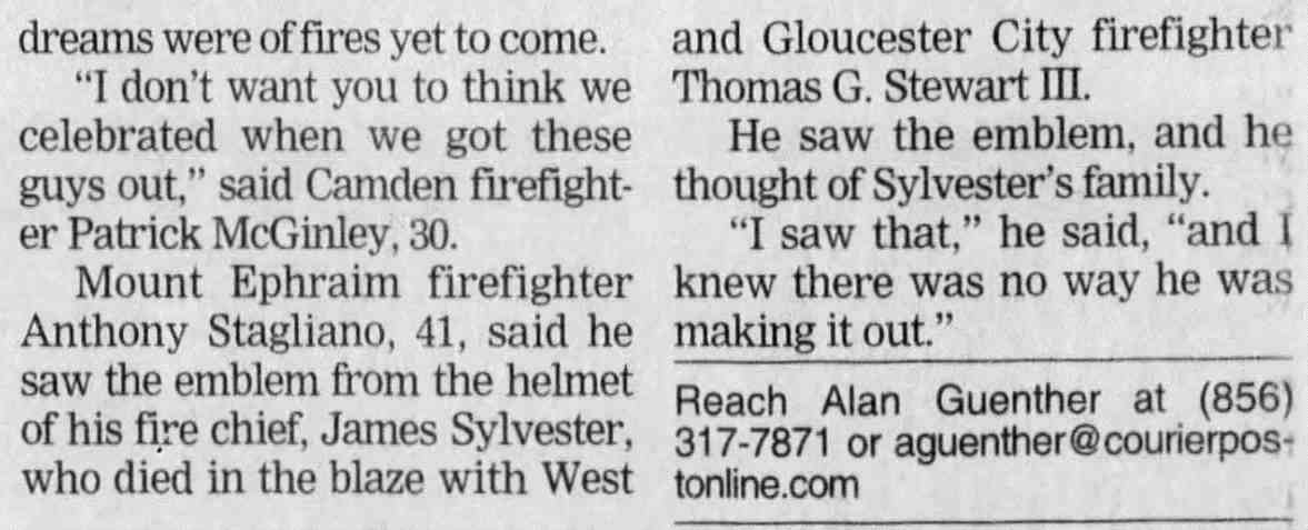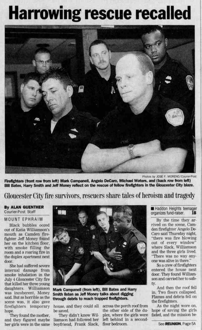 MICHAEL P. "HOPPER" WALTERS was born on July 23, 1958 to Howard Vincent Waters and his wife, the former Dorothy Jean and Dorothy Regina McGuire. He was one of six children. The Waters family had bought the home at 2976 Congress Road in the Fairview section of Camden in 1947 and they were still living at that address as late as 1997, despite Howard Waters passing in 1966 and Dorothy's in 1970. Michael Waters was appointed to the Camden Fire Department on May 9, 1994. He served for 23 years, many of them with Ladder Company 2, before respiratory problems forced an early retirement in 2014. Michael Waters was last a resident of Audubon, New Jersey. He died on June 1, 2018, survived by his wife, Jean, and five children. |