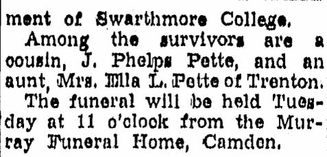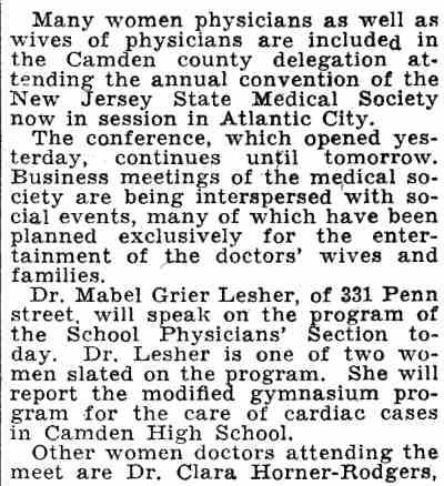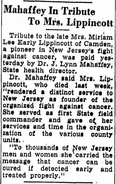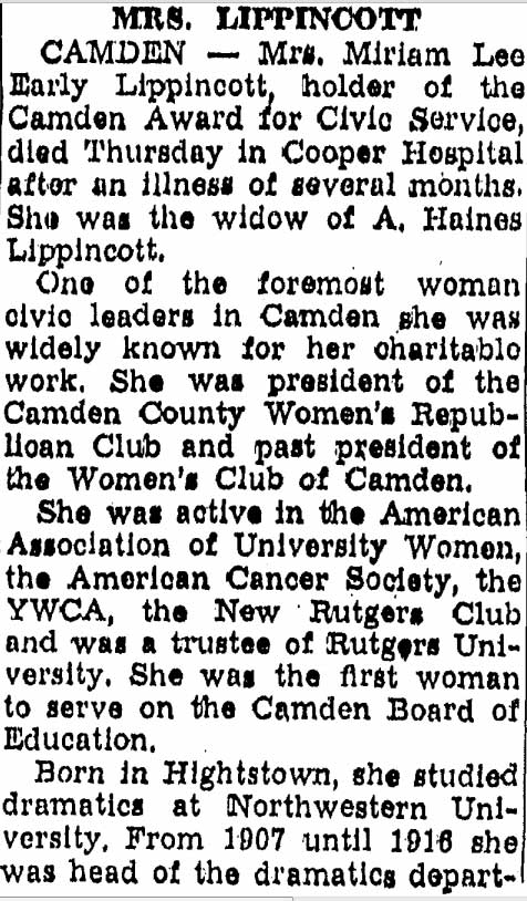 MRS. A. HAINES LIPPINCOTT was born Miriam Lee Early. An 1896 graduate of the Pennington School, above Trenton, she married a widower, Dr. Ahab Haines Lippincott Jr. of Camden NJ sometime after the 1910 Census. Miriam Lippincott was quite active in the Woman’s Club of Camden , and was elected to the Board of Directors of that group in March of 1917. Among her fellow club members were Mrs. Lulu S. Read and mrs. helen mather . She was also quite active in Republican politics. Mrs. Lippincott served as president of t he Camden County Women's Republican Club for Civic Betterment in 1931, was New Jersey chairman of the Women's National Committee for Law Enforcement, and was involved with other civic organizations in Camden and South Jersey. She and Mrs. Zula Boyd Casselman, the wife of Dr. Arthur J. Casselman, were founding officers of the Women's Field Army of South Jersey. Both women were quite active with the American Cancer Society. Dr. and Mrs. Lippincott lived at 406 Cooper Street by the time the Census was taken in 1920. Dr. Lippincott passed away in 1937. Mrs. Lippincott continued to live at the Cooper Street address as late as 1947. She was a member of Centenary-Tabernacle Methodist Episcopal Church, at 5th and Cooper Streets. |