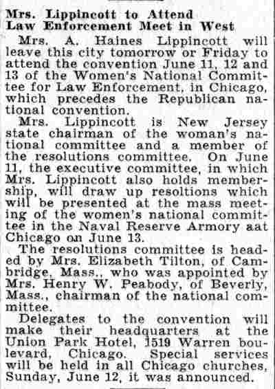 Mrs. A. Haines Lippincott, of Camden, will speak on "World Peace," at a meeting of the Burlington County Women's Republican Club, to be held Thursday afternoon in the firehouse at Bridgeboro. Mrs. Lippincott, well-known peace advocate and club woman, will be the principal speaker. A covered dish luncheon will precede the meeting and Mrs. Pearl M. Bridegum, of Hainesport, who is president of the club and vice chairman of the New Jersey State Republican Committee, will preside.. |