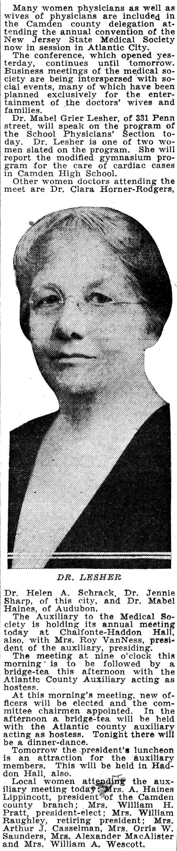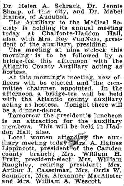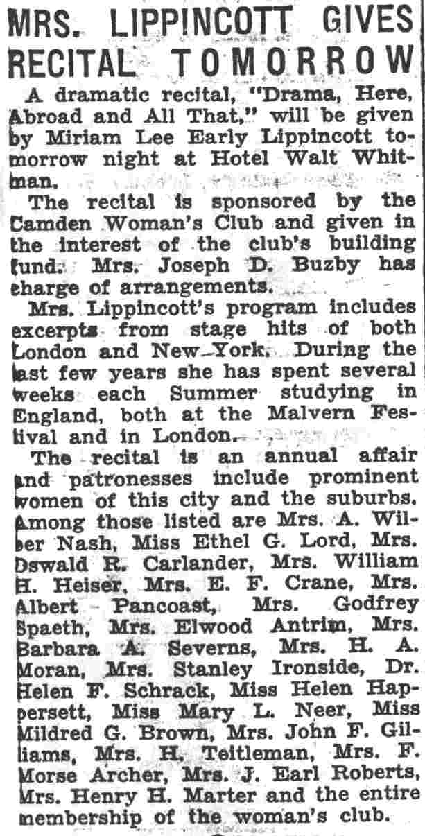 Camden Courier-Post October 28, 1936 Hotel Walt Whitman Miriam Lee Early Lippincott Mrs. Joseph D. Buzby Mrs. A. Wilbur Nash Miss Ethel G. Lord Mrs. Oswald R. Carlander Mrs. WIlliam H. Heiser Mrs. E.F. Crane Mrs. Albert Pancoast Mrs. Godfrey Speath Mrs. Elwood Antrim Mrs Barbara A. Severns Mrs. H.A. Moran Mrs. Stanley Ironside Dr. Helen F. Schrack Miss Helen Happersett Miss Mary L. Neer Miss MIldred G. Brown Mrs. John F. Gilliams Mrs. H. Teitleman Mrs. F. Morse Archer Mrs. J. Earl Roberts Mrs. Henry H. Marter |