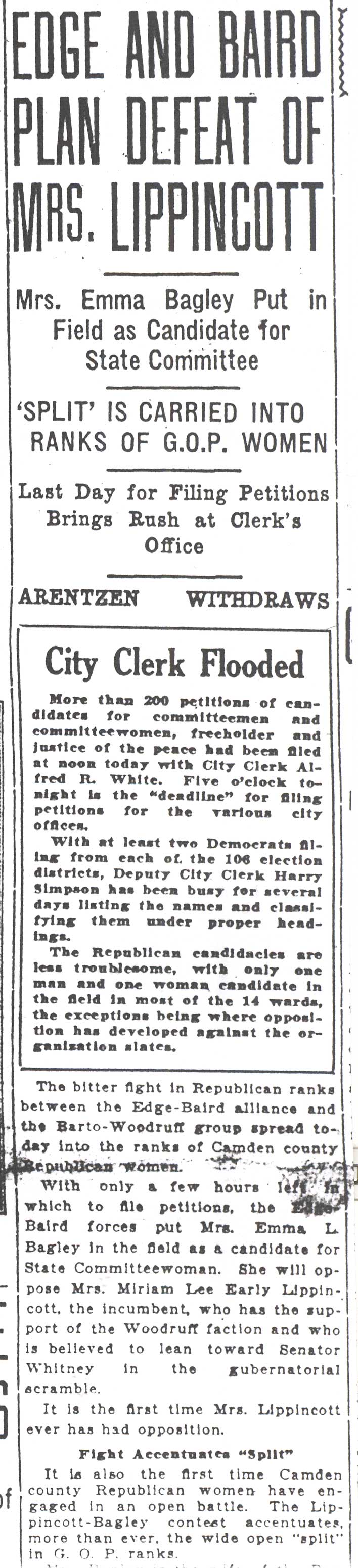 Mrs. Miriam Lee Early Lippincott, social and civic leader, will hold an afternoon tea at 3 p. m. Thursday in behalf of the Republican candidates at her home, 406 Cooper street. Among speakers will be Albert E. Burling, candidate for state senator; Edwin G. Scovel, Henry M. Evans and J. Claud Simon, candidates for the Assembly; Mayor Joseph Van Meter, for sheriff; Dr. Leslie H. Ewing, for county clerk, and Joshua C. Haines. candidate for Register of Deeds, and Cecil Rotzell, attorney, and George Walton. |
