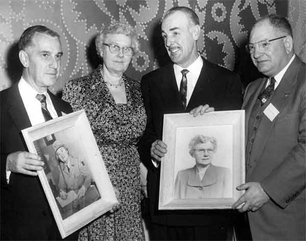 Mrs. Zula Boyd Casselman with officials of the New Jersey State Division of the American Cancer Society (AMC) at the presentation of portraits of (left) Mrs. Miriam Lee Early Lippincott and Mrs. Casselman, founders of the Woman's Field Army for the Detection of Cancer of Southern New Jersey, the Society's antecedent. The portraits were presented for installation at the Society's state offices. |