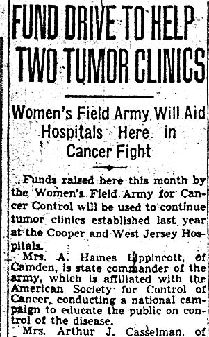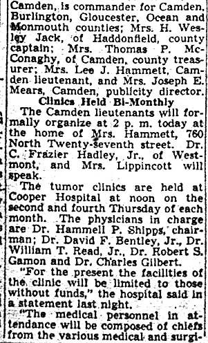 member of the Cooper Hospital staff, in charge of the out-patients diabetic clinic. Dr. Anderson covers the entire state of Pennsylvania. She is the psychiatrist in charge of the women's division in the Pittsburgh City Hospital and the Allegheny County Hospital. She is assistant professor of nursing at Duquesne University and a special lecturer on mental hygiene in the department of nursing education at the University of Pennsylvania. "Emotional Hygiene, the Art of Understanding" is the title of a book which was written by Dr. Anderson during the past year and which recently has been published. Mrs. Orris W. Saunders, of this city, is hospitality chairman for the day. Mrs. Arthur J. Casselman, of this city, and Mrs. E. Reed Hirst, of Haddonfleld, will pour and those assisting will be Mrs. William Braun, Mrs. Penrose Thompson, Mrs. A. Lincoln Sherk, of Merchantville; Mrs. Kenneth B. MacAlpine, of Gloucester; Mrs. Kenneth Athey and Mrs. Alfred M. Elwell, of this city. The Auxiliary has planned a fashion show to be followed by cards for Monday evening, March 7, in the Hotel Walt Whitman. Mrs. H. Wesley Jack, of Haddonfield, is general chairman for the affair. Mrs. Oswald R. Carlander, of Merchantville, is president of the Auxiliary. |