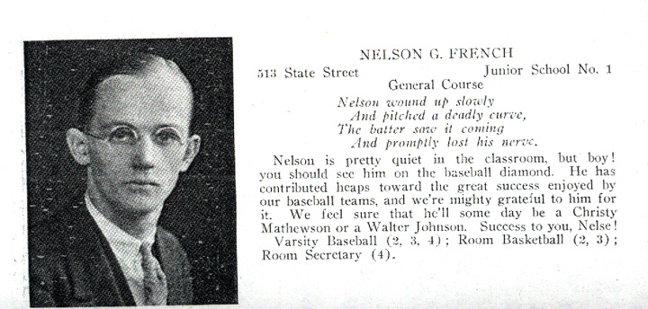 NELSON GILBERT FRENCH was born August 7, 1907. He was the son of Samuel J.T. French Sr. and his wife Alma Ashley Cavileer French. He also was a great-great-great-grandson of American naval Captain Micajah Smith, of Chestnut Neck, on Little Egg Harbor in Atlantic County NJ. Captain Smith brought in the large British freighter Venus , of London, in August, 1778. This and other American activities in and near Chestnut Neck brought about a British attack, which was unsuccessful in the first week of October 1778. This became known as the Battle of Chestnut Neck. The elder French and his brother William were prominent lawyers in Camden. William eventually was made a judge, and Samuel J.T. French Sr. was involved in civic affairs in Camden, chairing one of the early commissions working on bringing a bridge or tunnel between Camden and Philadelphia. He also ran unsuccessfully for Congress as a Democrat against Charles A. Wolverton in 1932. By 1913 the French family was living at 513 State Street in North Camden. Besides Samuel Jr. there were three other children, Nelson, Lillian, and Richard French. The family would summer at the Jersey shore, spending vacations and weekends at Port Republic NJ. Both Nelson French and younger brother Samuel graduated from Camden High School, Nelson in 1926 and Samuel two years later. Both French brothers were well known baseball players. Nelson was a star pitcher for Camden High and had a tryout with Connie Mack's Philadelphia A's, and his brother caught him. The French brothers teamed up as pitcher and catcher in Camden for teams such as the Carmen F.C. and the East Side Athletic Association. The brothers also pitched for the Port Republic team in the South Jersey League, which their father managed in the early 1930s. After graduating from Camden High School in 1928 Nelson G. French went on to a career which culminated as his serving as Secretary at the Philadelphia Stock Exchange. He died at Port Republic NJ in June of 1974. |