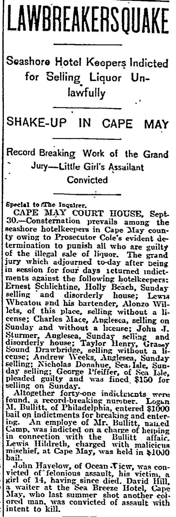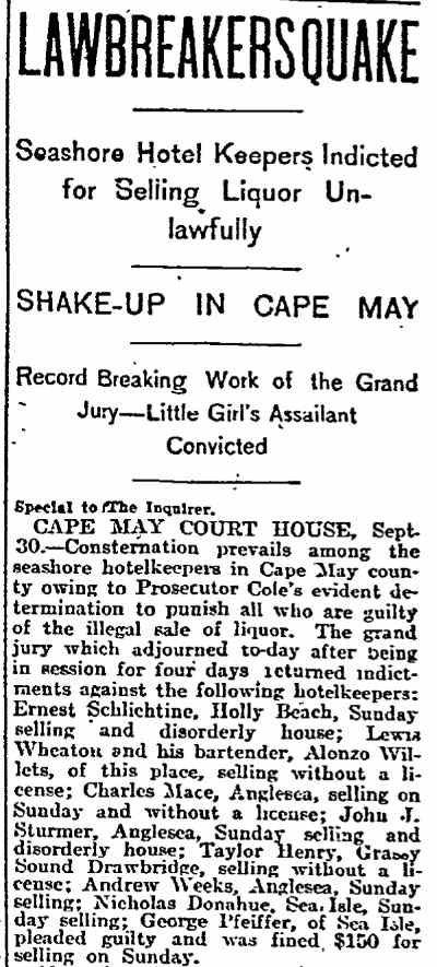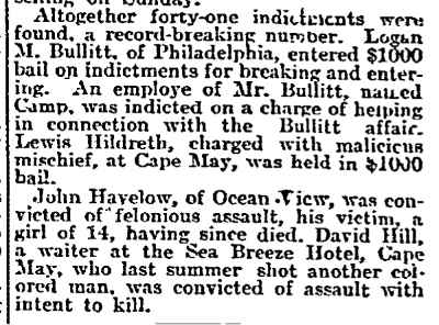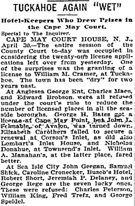NICHOLAS J. DONAHOE, sometimes referred to as Nicholas J. Donahue, operated a restaurant in East Camden and was involved in real estate in Camden in after coming to the city in the late 1890s. He was born in Pennsylvania in, according to the 1900 Census, December of 1860. Nicholas Donahoe operated a restaurant in Townsend's Inlet, near Ocean City, New Jersey in the 1890s. This business was destroyed by a storm, possibly a hurricane, in the late 1890s. He attempted to procure a liquor license in April of 1897 but was rejected in October of that year. He did hold a license in 1898 in Sea Isle City in 1898. He was fined in October of that year for selling liquor on Sunday. Nicholas Donahoe and his sister Ellen came to what is now East Camden, then still the Town of Stockton, and opened up an oyster restaurant at 2402 Federal Street shortly before the compilation of the 1898 City Directory. In 1900 he opened up a cigar store at 2404 Federal Street and operated both businesses in these premises into 1902. He then acquired two properties across the street, one being 2407 Federal Street, built in 1897 as a firehouse occupied by Stockton Hose Company No. 2, and the other, 2409 Federal Street, which appears to have been an empty lot until his purchase. A two story building was erected on this site, where Nicholas Donahue operated a restaurant through at least 1913. He conducted his cigar business at 2407 Federal Street through 1917, and also rented out space in the building, which had become to be known as Donahoe's Hall. Ellen Donahoe passed away in November on 1919 and was buried at Calvary Cemetery in Delaware Township (present day Cherry Hill), New Jersey. Nicholas Donahoe sold his real estate holdings in during the 1925-1926 real estate boom, and lodged for a time at 308 North 27th Street, then, with age taking its toll, moved to Philadelphia to stay with a nephew. John Donahoe, in Philadelphia. This did not go well, and he went to live, on the advice of his lawyer, Raymond Donges, on Chincoteague Island in Virginia, where he passed away on September 12, 1927. There was controversy surrounding Nicholas Donahue in his last days, as his nephew attempted to, by ruse, kidnap him and take him back to Philadelphia, apparently in an effort to secure his estate. |
