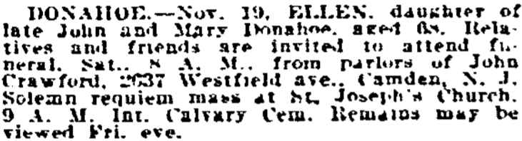 Donohoe - John Donohoe - Mary Donohoe John Crawford - Westfield Avenue - St. Joseph Church |