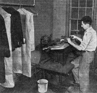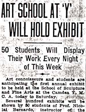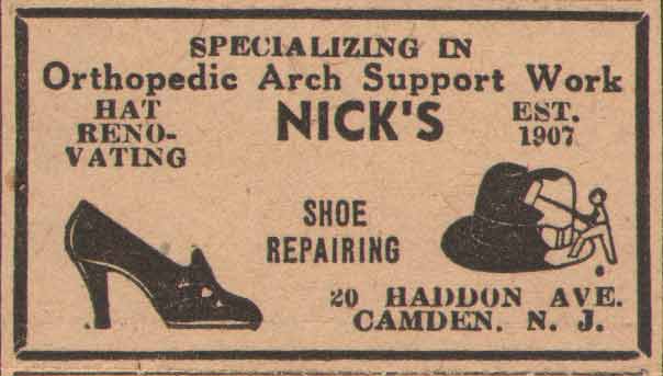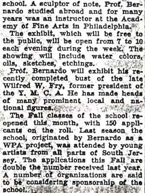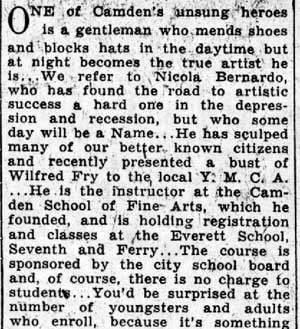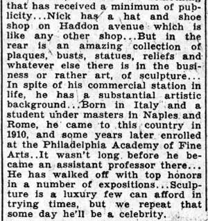 Arts Don't tell Nicola Berardo a shoemaker should stick to his last. Nick, as he is known, is a sculptor by profession and a shoemaker by fate, and his patrons have the privilege accorded to few other customers of the gentlemen in olden days known as cobblers. Nick has a shoe repairing shop at 20 Haddon avenue and his patrons can visit his studio there, whenever they drop in for a pair of rubber heels or to get the old "kicks" half-soled. Bernardo is a cobbler, but he likewise is an artist and a personage. His years are 48, but he has been immersed in sculpture, so to speak, since he was a youth of nine. At present he is in charge of the Academy of Fine Arts, operating under the benevolence of WPA, where the maestro makes $20 a week, which is something like penury to a man who was kicked out of $100,000 when the depression settled its sinister mantle on this land. Three Bright Pupils Despite this rebuff of fate, Nick is yet an optimist, who is happy over the fact that he has 500 pupils ready to dabble in sculpture, three of whom are positive geniuses to the master. One is a Russian miss of 16, another a French girl, 50 whose only identity to Nick is "Hazel of Palmyra" and Tony DiFelipo, 19, of Camden. "They are positive geniuses" opined Nick, in chatting about his discoveries, "and some day they should make their mark as great sculptors." Nick's own career reads like something out of Arabian Nights. Back in Casertto, where he was born—Casertto is a little city near Naples—Nick's father had a good railroad job. Nick early evinced a natural Latin strain as an artist, so the parents sent him at the age nine, to the Academy of the Fine Arts in Naples. "I was there until I was about 13," said Bernardo, "when my father lost his job and I had to go back home to help the family fortunes. I did some sculpture then, made money in a little studio I had near the railroad station, and when I had enough I went to the Royal Academy in Rome. Came to Camden "When I was about 16 it looked as if the family fortunes would never mend enough for me to become a sculptor, so I wrote to my uncle, Petrone, who lived in Camden and asked him to send me money to come to America." "That was 30 years ago when I was 18. My uncle sent me the steamship tickets, and gave me $5 to see me across the ocean. I landed in America with no knowledge of English and my uncle sent me to the Academy of Fine Arts in Philadelphia." "I began to do pretty well, and when I had some money I opened this shop—I've lived here ever since I've been in the United States—and put an Italian in as the workman. I learned my trade from him." "That's a fact, he taught me to be a shoemaker, all the time I was making good money in sculpture. I did the 'Indian' that stands on the lot where the old City Hail once stood and was given $18,000 for executing that commission. I did busts for the best-known men in Camden and altogether I must have made $100,000 from sculpture." "I put my money in real estate, bought this home and shop, and then bang! The depression came along, I lost all the property in which I had invested my money, and believe it or not I'm paying rent for this very house today, the home I had bought when things were prosperous." Grandsons Have Talent Heredity also has come into its own in the person of Nick's two grandsons, Jerome, 10, and William, 12, both of whom are pupils at St. Mary's Parochial School. They are children of Nick's daughter, Theresa, and their childish talent runs to painting. Nick says he has a flair for the brush and that he teaches his grandsons how to work in oils and that for juvenile artists, they are both good. Inside his shop are pieces of sculpture that lend an artistic atmosphere that the whirring machines and the spinning brushes cannot eradicate. Behind the repair shop is the studio where things that have transpired are housed until Nick can find other lodgings for his masterpieces. There is a magnificent full length statuette of the late Dr. S. Weir Mitchell, of Philadelphia, one of the world famous neurologists and an author as well. Likewise are busts of some of Camden's best known citizens, all of which art work has grown a trifle ivoried by age. Nick treasures a photograph from Constance Bennett, the screen actress, autographed, a souvenir of a pupil that Nick taught, and who was a protege of the Hollywood thespian. Two of Bernard's treasures are the originals of the design for the button worn by soldiers of the World War, who fought, under the Stars and Stripes, and the original also of the Navy button, awarded the seadogs who also fought for their country. Despite all the buffeting of fate and fortune, Nick still is the artist at heart, and for $20 a week he is teaching a class, doing cultural work that: he finds a balm to his feelings, wounded by the crass fortune that kicked him so unmercifully, when his fellows suffered its stings and arrows, too, starting in 1929. |