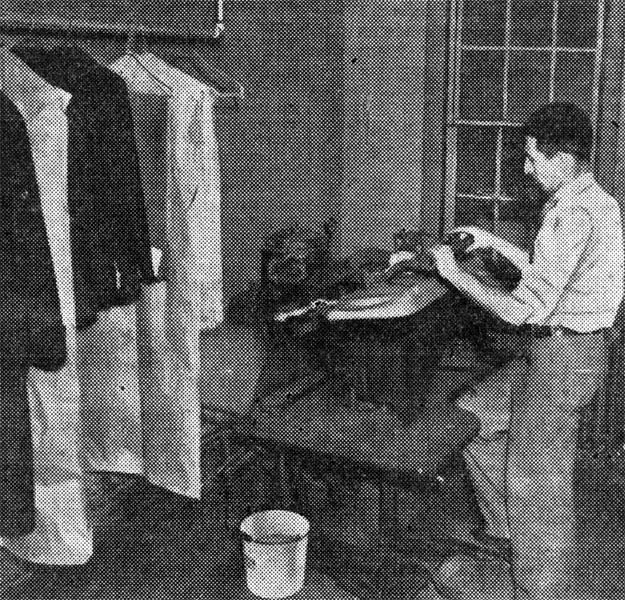 Nick Berardo, who teaches the class in sculpture under the auspices of WPA, ekes a living as shoemaker in his shop, 20 Haddon avenue, in the rear of which Nick's treasures of clay and marble. The young: woman who is engrossed in her artistic endeavor is Miss Madeline Palma, 525 Cooper Street, who is one of the master's prize students. She has been studying under Berardo for five months.