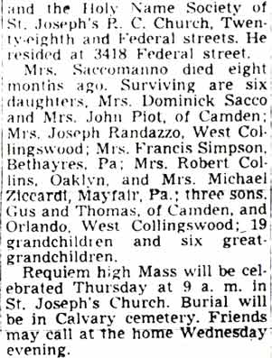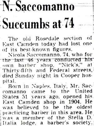 NICOLA SACCOMANNO was born in Naples, Italy around 1875. A barber by trade, he came to America in 1898, and opened up his own barbershop at 3418 Federal Street in the Rosedale section of East Camden in 1904. With his wife Marie, he lived over the shop, and raised nine children. He was a member of the Holy Name Society of St. Joseph's Roman Catholic Church in East Camden, a barber's society, and the Stella D'Italia lodge of the Sons of Italy. Nicola Saccomanno conducted his business on Federal Street for 46 years, until his passing on July 30, 1950. After services at St. Joseph's Church on Federal Street in Camden, he was buried at Calvary Cemetery in what was then Delaware Township (present-day Cherry Hill) NJ on August 3, 1950. A family member, Gus Saccomanno, owned and operated The Little Tavern in the Cramer Hill section of Camden in the 1960s and 1970s. |