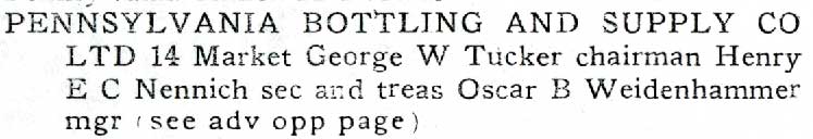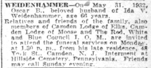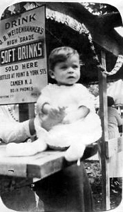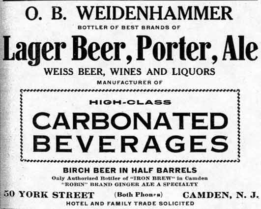 OSCAR WEIDENHAMMER was born at Richmond in Berks County PA around 1864. His great-grandfather, George Weidenhammer, had fought in the Revolutionary War, as a Private in the 2nd Battalion, 7th Company, from Maidencreek PA. George Weidenhammer later rose to officer's rank, and from 1790 through 1800 was a Captain of the 3rd Company, 1st Regiment from Pennsylvania. Oscar Weidenhammer was working on his father Adam's farm when the census was taken in 1880. He moved to Philadelphia shortly after the 1887 Philadelphia City Directory was compiled, and soon after married Ida V. Eggert. By 1890 Philadelphia City Directory lists him as a laborer, and living at 2111 Orkney Street. Oscar Weidenhammer may have already been involved in the bottling business when the 1890 Directory was compiled. The Directories for 1892 and 1893 show him as still residing on Orkney Street, and working as a bottler. The 1894 Directory has him as a laborer, and living at 2022 North 5th Street. He may well have been laboring in the bottling business, as the next available directories, for 1897 and 1898, show him once again as a bottler, no living at 1315 Wishart Street. The Philadelphia City Directories from 1899 through 1903 show Oscar B. Weidenhammer as living at 2003 Madison Street. His occupations progressed from bottler to foreman to manager. It appears he was working for a Philadelphia firm, the Pennsylvania Bottling and Supply Co., Ltd., which had facilities at 14 Market Street in Camden and 2915 Kensington Avenue in Philadelphia, and by 1903 he was managing the firm's Camden branch, replacing Henry E. Nunnich. The 1903 Camden City Directory lists Oscar Weidenhammer as the company's manager, and residing in Philadelphia. The Philadelphia Directory seems to confirm this. A daughter, Estella, was born on October 23, 1902. Census information states that she was born in New Jersey, this may have occurred shortly after the information for the directories were compiled. Camden City Directories from 1904 through 1913 indicate that Oscar and Ida Weidenhammer lived at 904 North 6th Street in North Camden. The 1912 directory indicates that Oscar Weidenhammer was still working for Pennsylvania Bottling & Supply, while the 1913 directory simply states that he was working in the bottling business at 14 Market Street in Camden. The next directory, that of 1914, shows that Oscar Weidenhammer had made a significant move. The Camden City Directory for 1914 shows that Oscar Weidenhammer had established a bottling business, the Weidenhammer Bottling Works, at 50 york street in North Camden, and that he resided in the house next door, at 48 York. The 1930 Census shows that Oscar and Ida Weidenhammer still lived at 48 York Street. Oscar Weidenhammer passed away in June of 1932. The Weidenhammer bottling business remained in business at 48-50 York Street through at least 1936. By 1940 the business, then run by son-in-law Walter J. Beer, had relocated to 61 York, and the old property was being used by the Camden Casket Company. The bottling business survived to at least 1943, but was gone by the time the 1947 Directory was compiled. Ida V. Eggert Weidenhammer died at her daughter Estella's home, 2140 Scovel Avenue, Pennsauken NJ on July 30, 1946. She was buried at Hillside Cemetery. The daughter of a first cousin, Mabel Weidenhammer Brady, lived with her saloon-keeper husband Patrick at the corner of North 3rd and Erie Streets, a short walk from the Weidenhammer establishment from the late 1910s through the early 1930s. |
