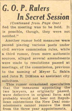 ON SALOON LICENSE The newly created city excise commission last night called a third public hearing on the application of Frank Caromano for a saloon license at Thirty-sixth street and Westfield avenue. The hearing was set for 10 a. m., Saturday. The city commission held one formal hearing and one informal hearing on the application, protested by 881 citizens of the Rosedale section of the Eleventh ward, led by Rev. W. Douglas Roe, pastor of the Rosedale Baptist Church. Granting the application, Roe and others have contended, will open the Rosedale section, now without saloons, to other applications. The excise commission—formally the Municipal Board of Alcoholic Beverage Control—in practice adopted a policy of "go slow." It was the first business meeting of the board, composed of John L. Morrissey, chairman; Mrs. Ann Baumgartner, secretary, and Curtis O. Sangtinette. Takes Notes of Meeting Mrs. Pauline F. Caperoon, secretary to City Commissioner Mary W. Kobus, director of public safety, took stenographic notes of the meeting. She explained this was merely to keep the board straight until the new board becomes more familiar with procedure.